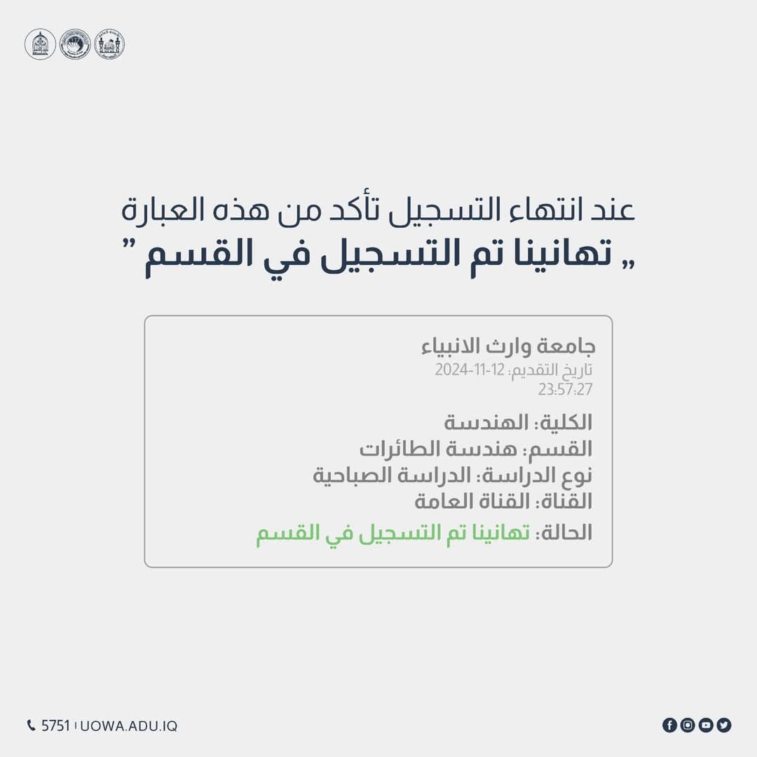 *يكون تسجيل الطلبة المتقدمين لكليات واقسام الجامعة من الساعة ٨صباحاً ولغاية المساء، عدا (كلية الطب) فيكون التسجيل #حصرا بعد الساعة ال٢ مساءً.