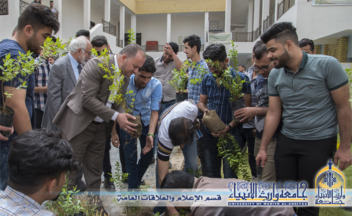 طلبة كلية الادارة والاقتصاد مع رئيس الجامعة أ .د طالب الموسوي يتشاركون غرس شتلات الاشجار في حدائق جامعة وارث الانبياء عليه السلام لتنمية القيم البيئية.