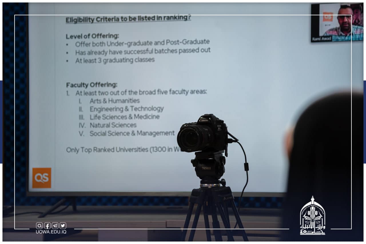 برعاية السيد رئيس الجامعة الأستاذ الدكتور إبراهيم سعيد الحياوي اقام قسم ضمان الجودة والأداء الجامعي بالتعاون مع قسم الاعلام والعلاقات اجتماعاً تنسيقياً مع مؤسسة Quacquarelli Symonds للتصنيفات العالمية حيث تم مناقشة متطلبات التصنيف المختلفة والخدمات التي تقدمها المؤسسة، يأتي الاجتماع بالتزامن مع الجهود التي تذلها الجامعة لتضمين المتطلبات التفصيلية للتصنيفات العالمية ضمن خططها الاستراتيجية.