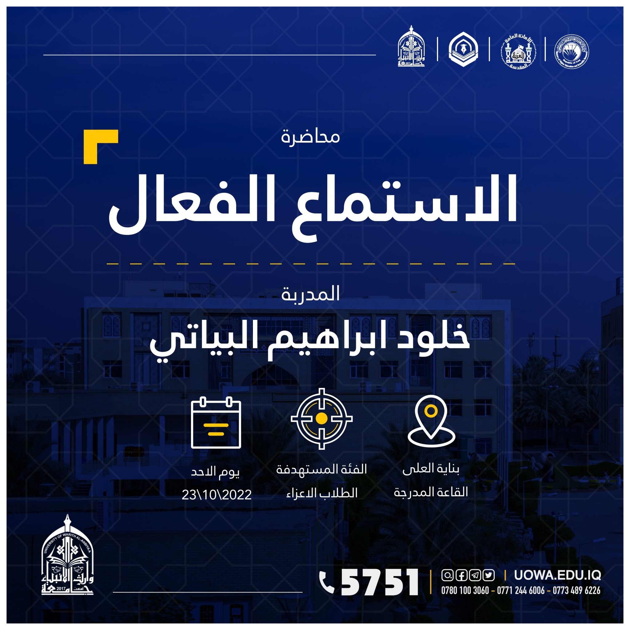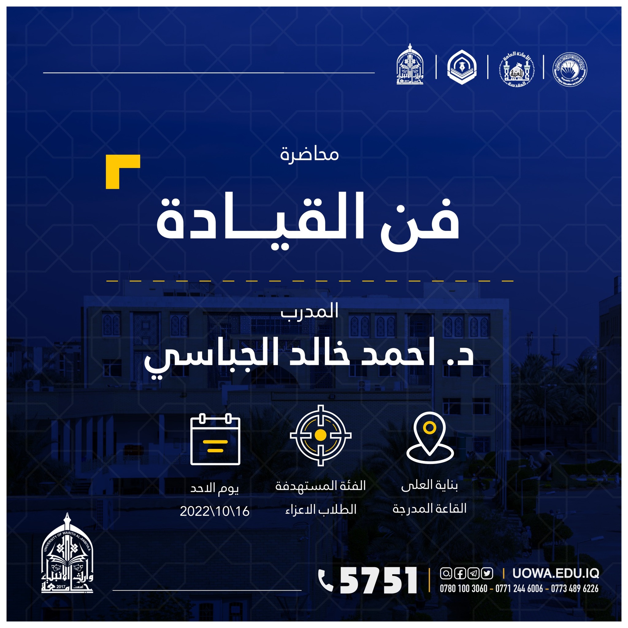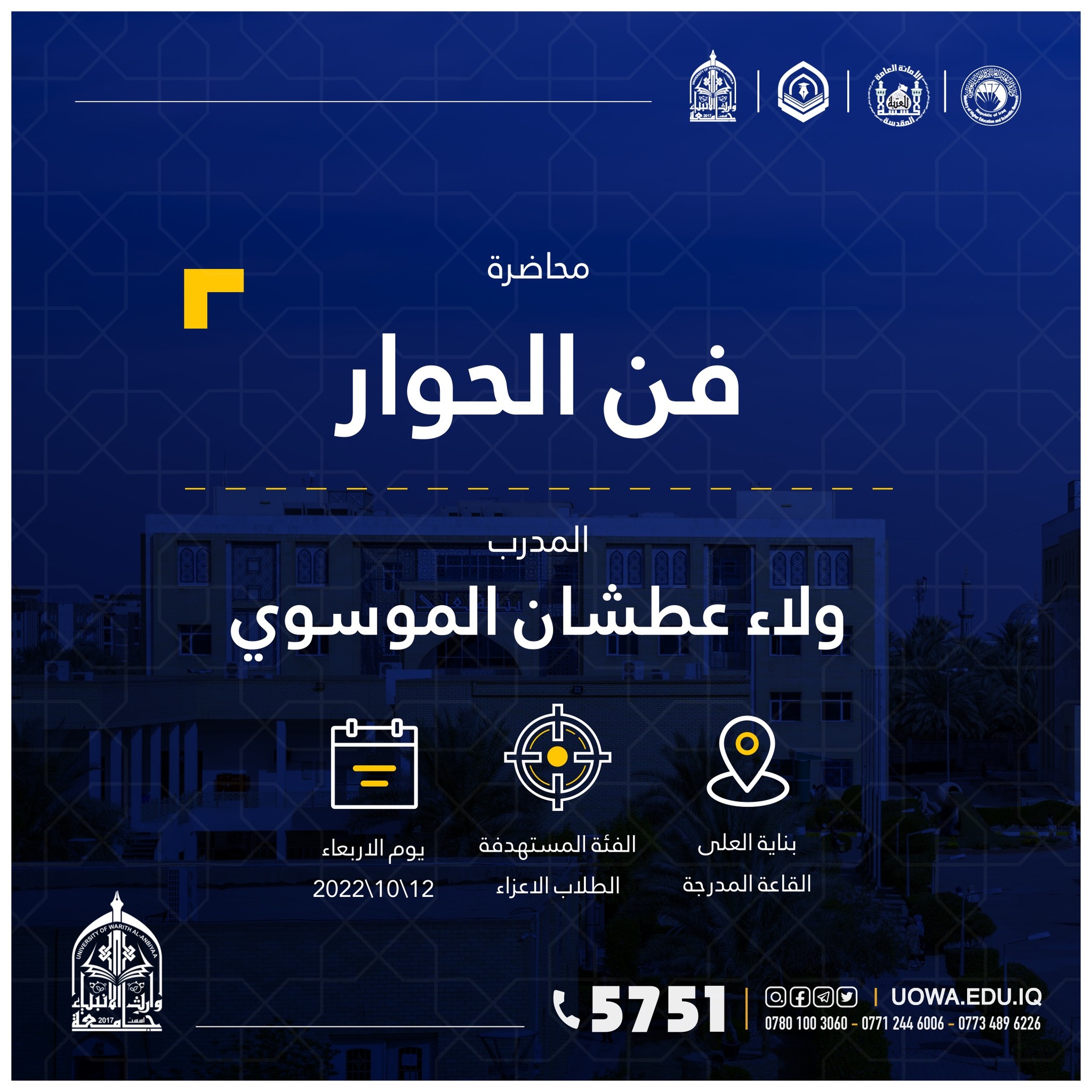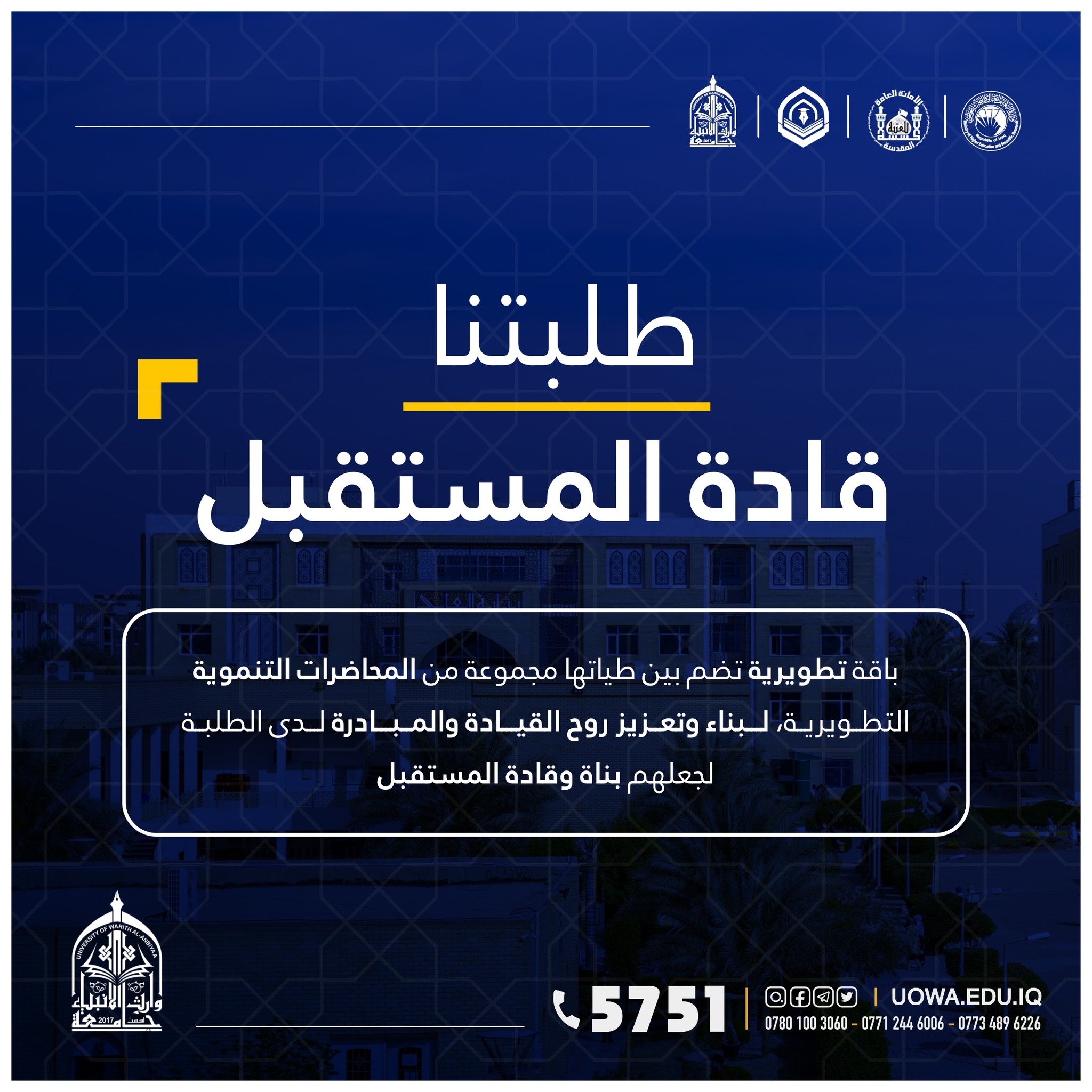 "طلبتنا قادة المستقبل" برنامج تدريبي يطلقه مركز التعليم المستمر في جامعة وارث الانبياء(عليه السلام) لطلبة الجامعة ،ابتداءً من يوم الاحد المصادف 9/10/2022 ،ولمدة تسعة ايام.