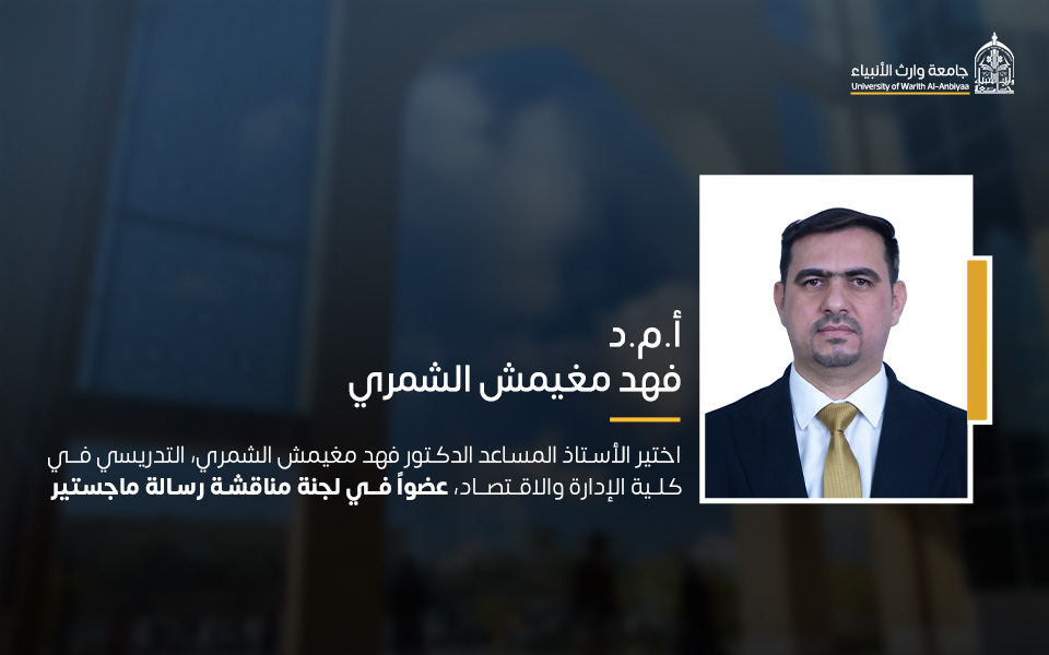 اختير الأستاذ المساعد الدكتور فهد مغيمش الشمري، التدريسي في كلية الإدارة والاقتصاد بجامعة وارث الأنبياء (عليه السلام)، عضواً في لجنة مناقشة رسالة ماجستير لأحد طلبة الدراسات العليا في كلية الإدارة والاقتصاد بجامعة القادسية، قسم العلوم المالية والمصرفية.