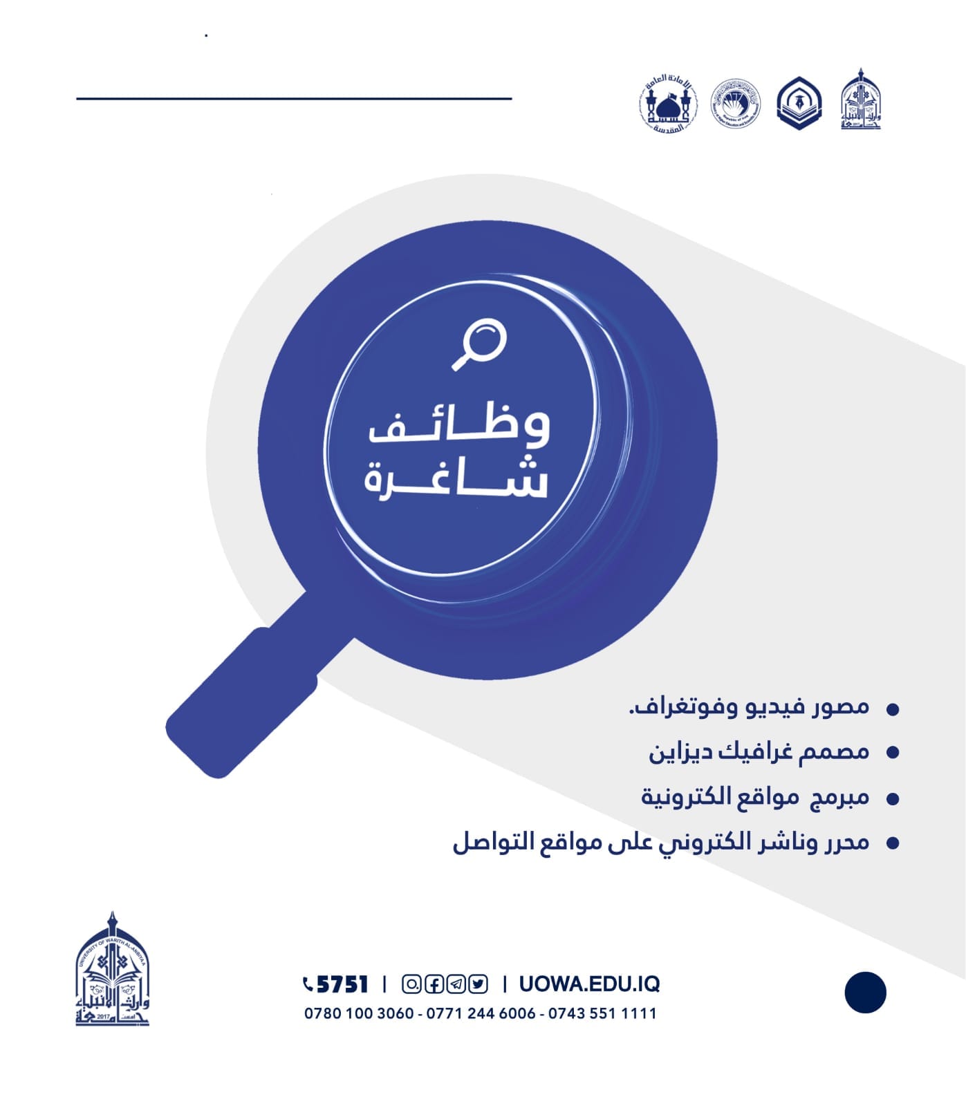 تعلن جامعة وارث الانبياء(عليه السلام) عن حاجتها إلى موظفين في قسم الإعلام والعلاقات العامة للعمل ضمن ملاك الجامعة وذلك حسب الاختصاصات الآتية: