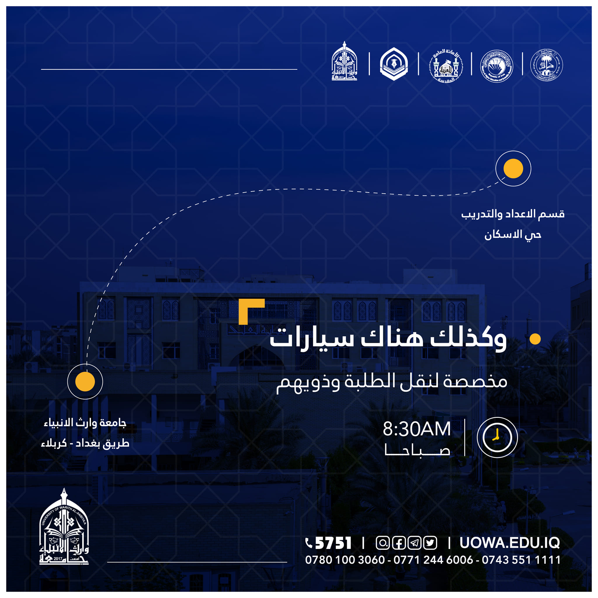 الى جامعة وارث الانبياء(عليه السلام) الساعة الـ (9:00) صباحاً، وكذلك هناك سيارات مخصصة لنقل الطلبة وذويهم من قسم الاعداد والتدريب في حي الإسكان الى الجامعة في الساعة (8:30) صباحاً.