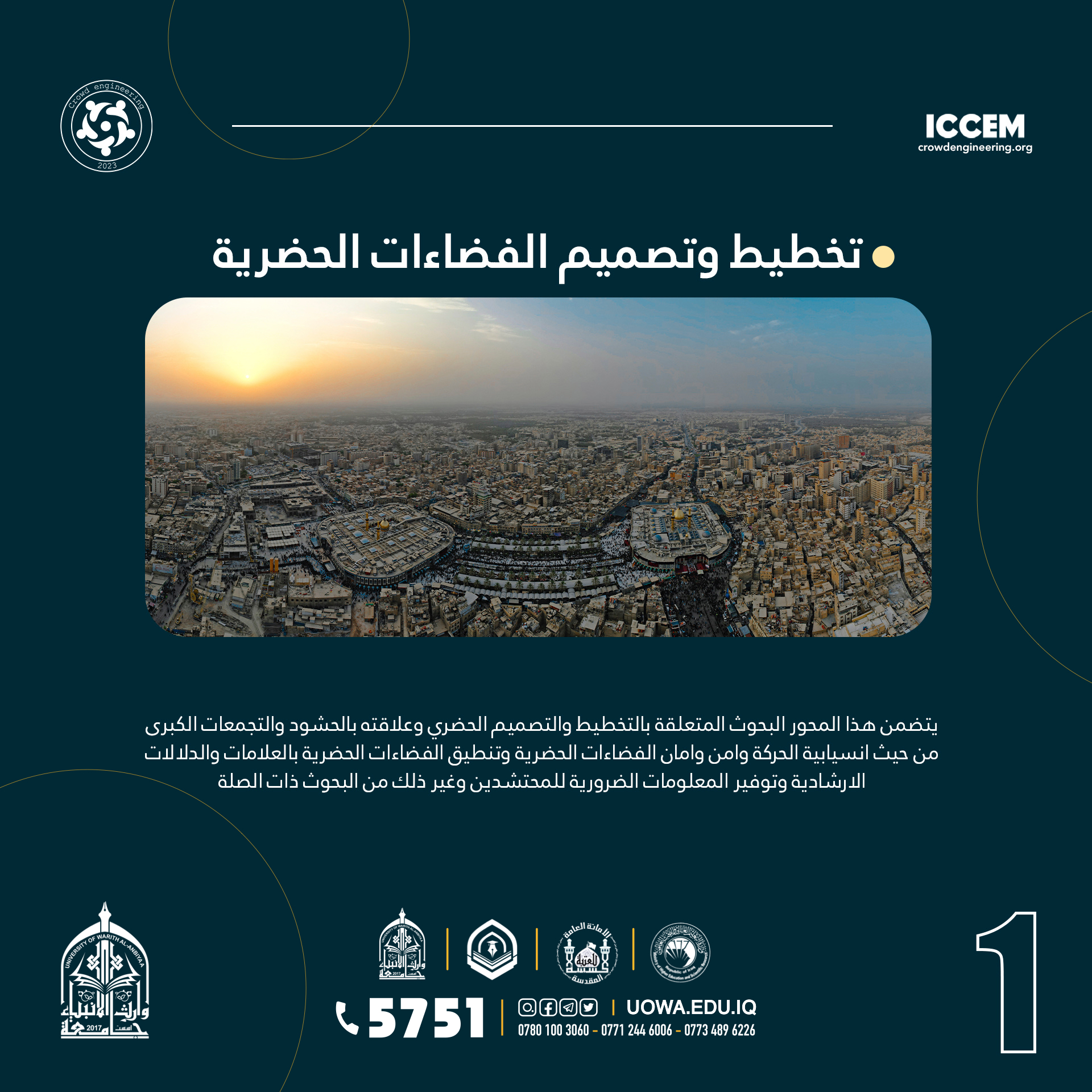 برعاية الامانة العامة للعتبة الحسينية المقدسة، تعتزم جامعة وارث الانبياء(عليه السلام)، والجمعية العلمية لبحوث الطرق والنقل العراقية، اطلاق مؤتمرها العالمي الاول لهندسة وادارة الحشود بعنوان "المؤتمر العالمي الاول لهندسة وادارة الحشود كربلاء المقدسة ، للفترة 22 -23 آذار 2023" .