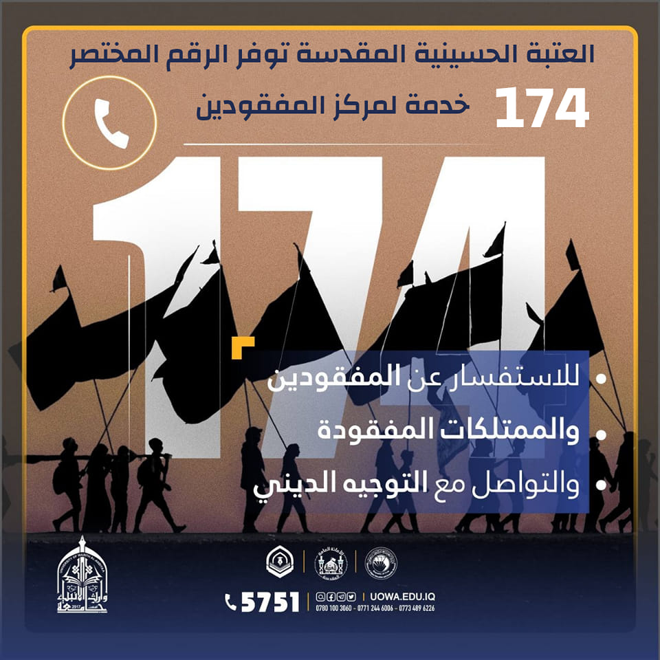 العتبة الحسينية المقدسة تخصص الرقم (١٧٤) للاستفسار عن المفقودين والممتلكات المفقودة وخدمات أخرى خلال الزيارة الأربعينية في كربلاء المقدسة.