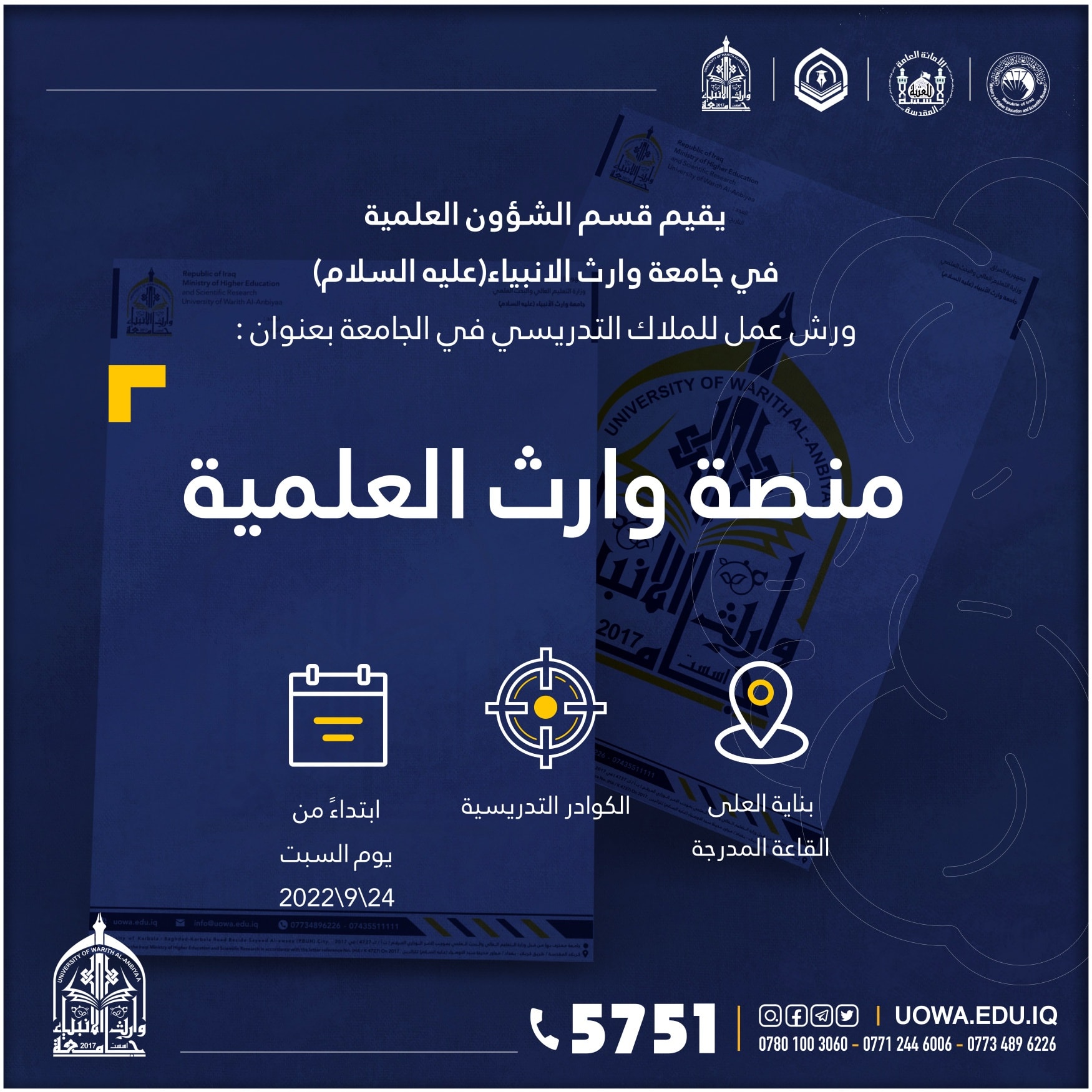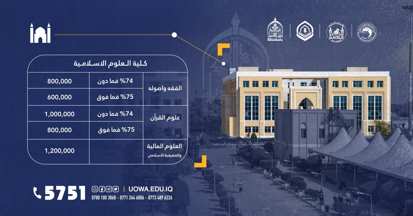 يسر جامعة وارث الأنبياء أن تعلن للطلبة الاعزاء الراغبين ببدء اولى خطواتهم في طريق النجاح عبر التقديم على كليات واقسام الجامعة، للعام الدراسي (2022-2023)