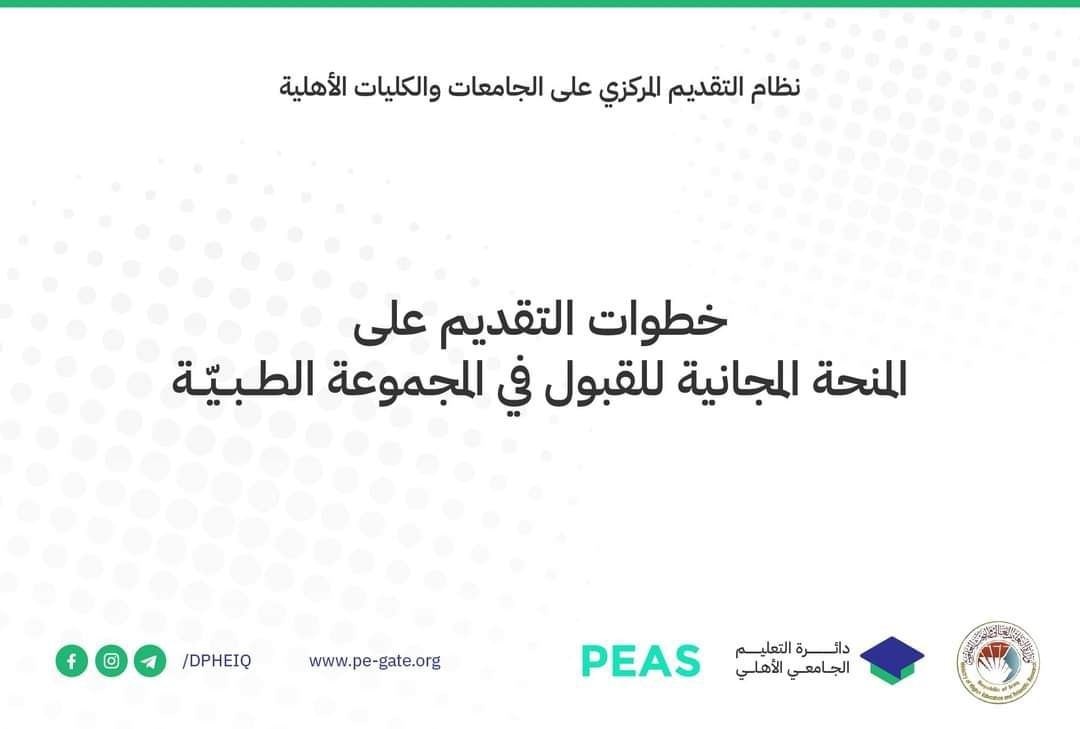 تعلن وزارة التعليم العالي والبحث العلمي عن إطلاق قناة التقديم الى المنحة المجانية لتخصصات المجموعة الطبية في الجامعات والكليات الأهلية للعام الدراسي 2023/2022.