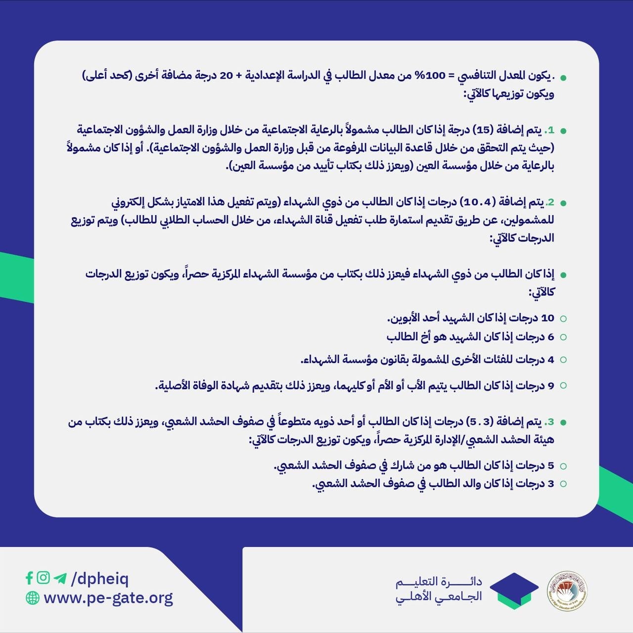 *يتم تفعيل قناة ابناء التدريسيين وحملة الشهادات العليا عن طريق مراكز التدقيق في الجامعات الاهلية.