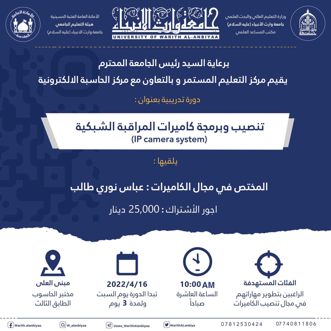 علماً أن أجور االاشتراك هي 25.000 دينار عراقي، والدورة تستمر لثلاثة أيام ابتداءً من اليوم السبت الموافق 16-4-2022.