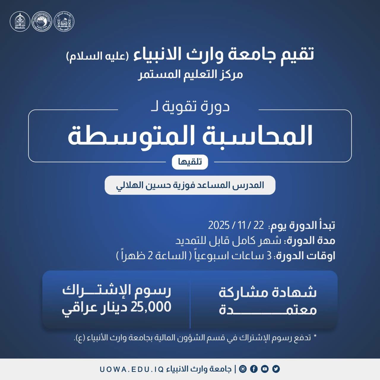 يسر مركز التعليم المستمر في جامعة وارث الأنبياء (عليه السلام) الإعلان عن استمرار التسجيل على دورة تقوية للمحاسبة المتوسطة ، التي ستبدأ من 22/11/2025📅، يقدمها المدرس المساعد فوزية حسين الهلالي.📋 تفاصيل الدورة:📆 المدة: شهر كامل قابلة للتمديد.⏰ الأوقات: 3 ساعات أسبوعيًا. (الساعة 2 ظهرًا)🌟 مميزات الدورة:📜 شهادة مشاركة معتمدة💰 الرسوم: 25,000 دينار عراقي، تدفع في قسم الشؤون المالية بجامعة وارث الأنبياء (ع).رابط التسجيل:https://forms.gle/oXYv4bWspLw85w2q6📞 لمزيد من التفاصيل:📩 البريد الإلكتروني:[email protected]