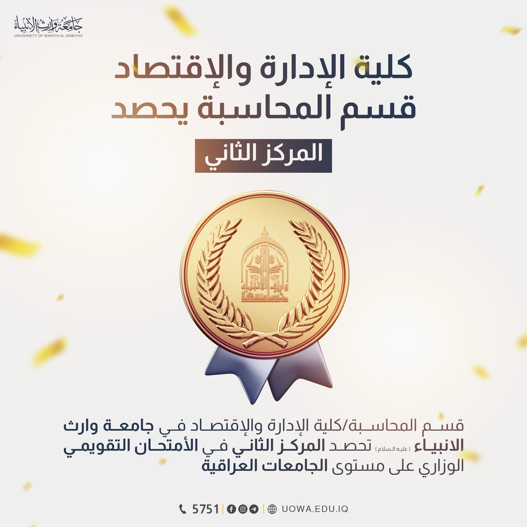 أحرز قسم المحاسبة في كلية الادارة والاقتصاد بجامعة وارث الأنبياء (عليه السلام) المركز الأول على الجامعات الأهلية وجاء في المرتبة الثامنة حكوميا ضمن نتائج التصنيف العراقي للأقسام العلمية، ما يعكس مستوى الأداء الأكاديمي المتميز للكلية ومكانتها المتقدمة ضمن مؤسسات التعليم العالي في العراق.