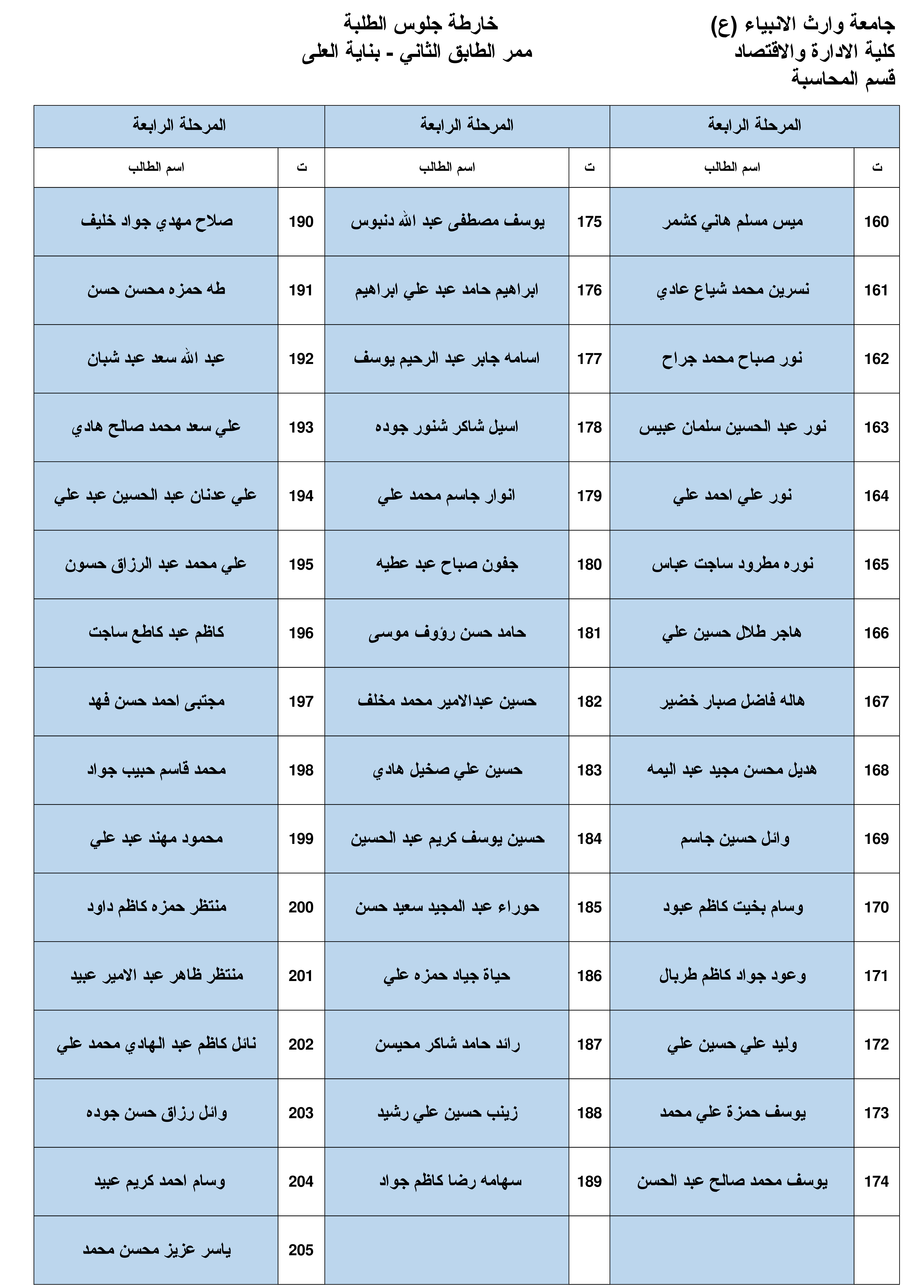 نرفق لكم خارطة الجلوس في القاعات الامتحانية لقسم المحاسبة للمرحلة الثانية والرابعة وكما موضحة في أدناه