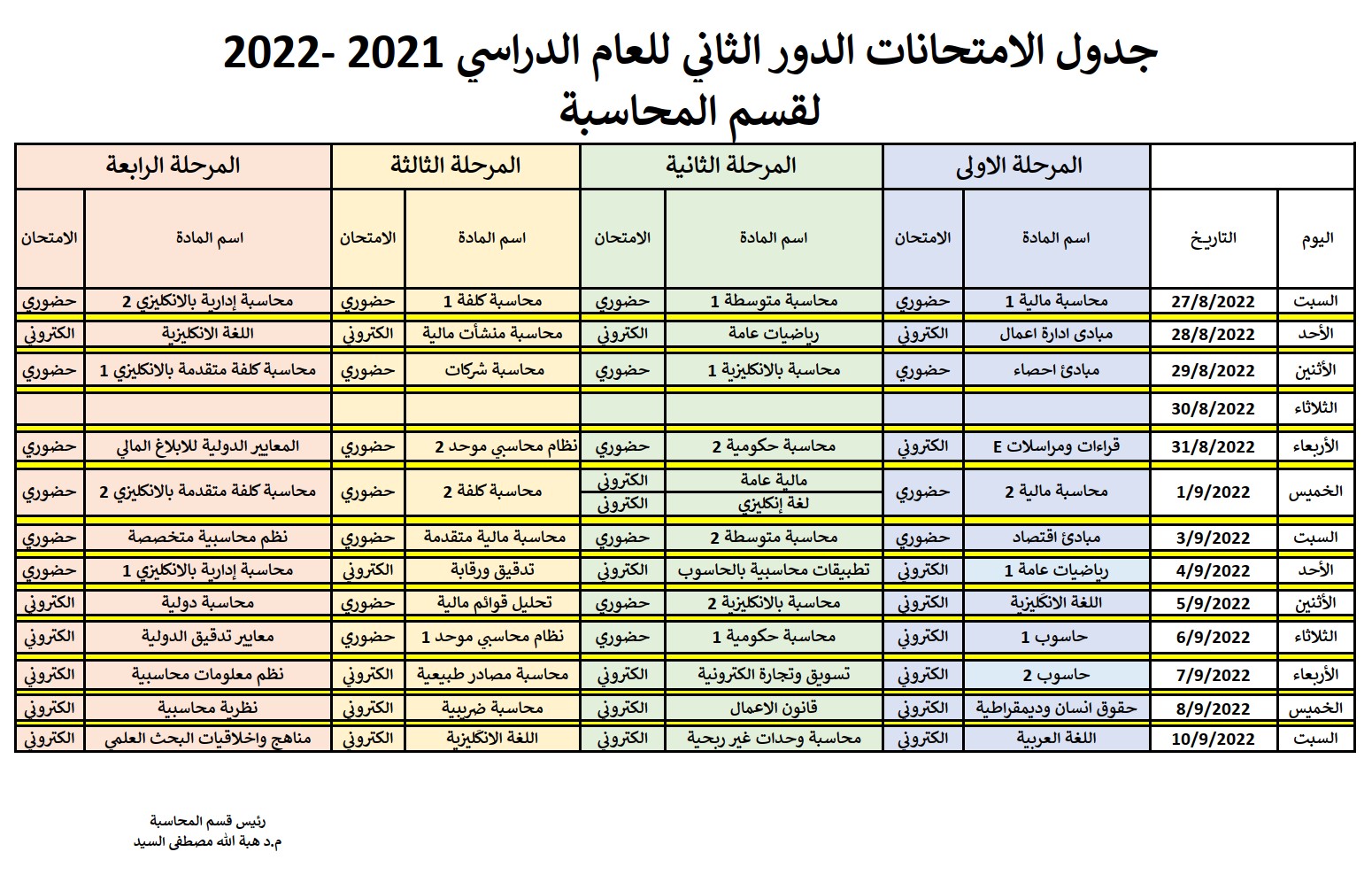 الطلبة الاعزاء .. تحية طيبة نرفق لكم جدول امتحانات الدور الثاني لقسم المحاسبة للعام الدراسي 2021-2022 وللدراستين الصباحية والمسائية تبدأ الامتحانات بتاريخ 27/8/2022 ولجميع المراحل ووقت الامتحان الساعة الـ 9:00 صباحاً تمنياتنا لكم جميعاً بالنجاح والتوفيق ~