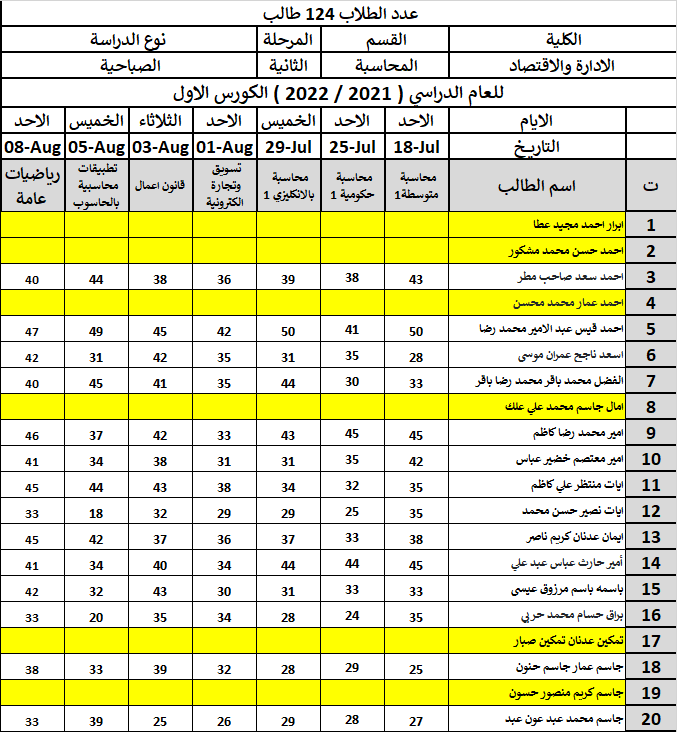 درجات السعي السنوي لطلبة قسم المحاسبة / المرحلة الثانية صباحي