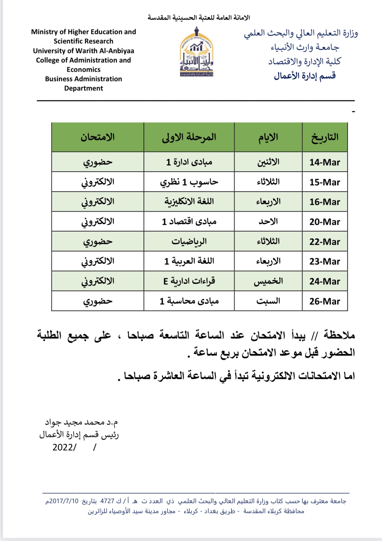 جدول الامتحانات الحضورية والالكترونية لنهاية الكورس الاول للمرحلة الاولى قسم ادارة الاعمال مع التعليمات الامتحانية