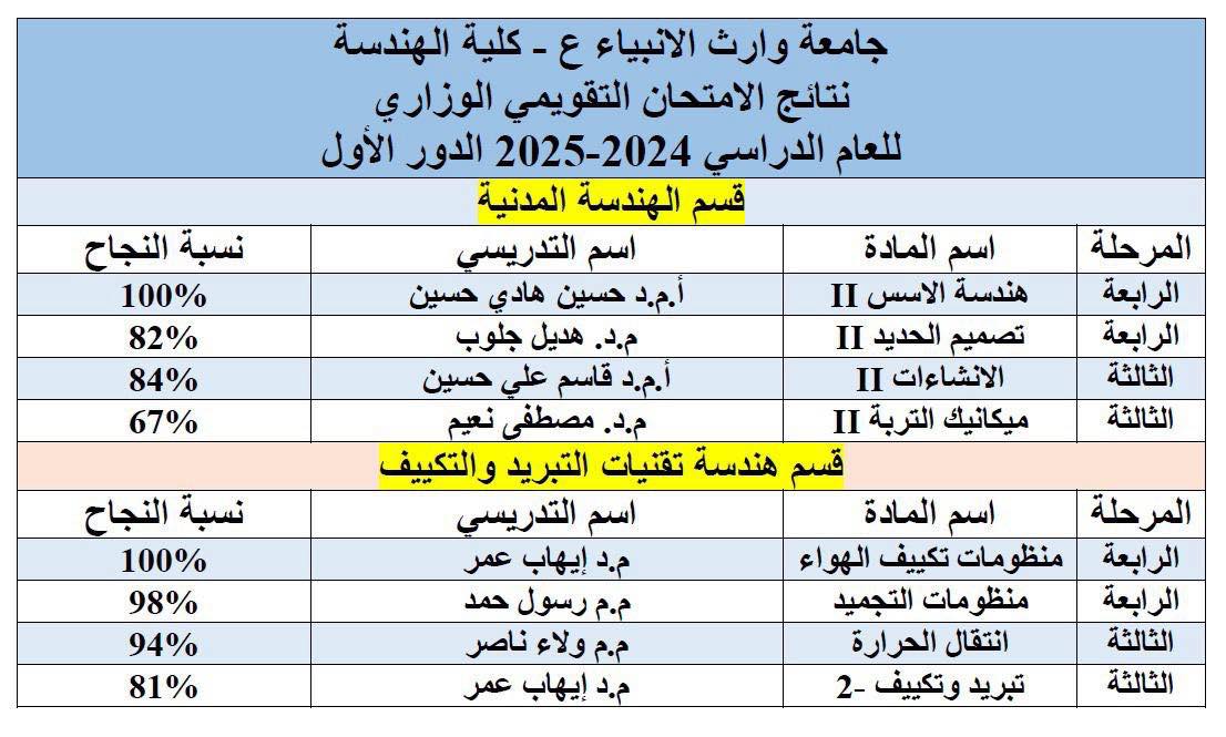 تفخر كلية الهندسة في جامعة وارث الأنبياء عليه السلام بتحقيقها المراتب الأولى والمتميزة في الامتحانات التقويمية الوزارية لقسمي الهندسة المدنية والتبريد والتكييف وذلك من بين أربع عشرة جامعة حكومية وتسع جامعات أهلية ويعد هذا الإنجاز شاهدا حياً على الرصانة العلمية التعليمية في كليتنا وعلى الكفاءة العالية التي تتمتع بها الهيئة التدريسية