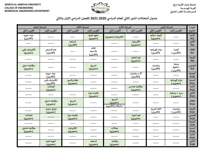 نظراً لانتهاء الامتحانات النهائية للفصل الدراسي الثاني تقرر اعلان و توزيع نتائج الامتحانات النهائية لطلبة قسم هندسة الطب الحياتي يوم السبت الموافق 21/8/2021 في رئاسة القسم حيث يتطلب من الطلبة الاعزاء اكمال براءة الذمة كشرط لأستلام النتيجة.