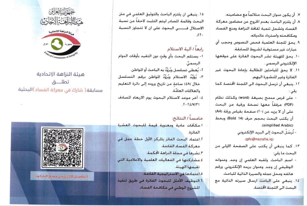فاز البحث المقدم من قبل كل من رئيس قسم هندسة النفط و الغاز الدكتور ضياء خفيف خشان و المهندس مرتضى وحيد خوام بمسابقة(شارك في معركة الفساد) البحثية التي اطلقتها هيئة النزاهة الاتحادية، البحث الموسوم كان بعنوان ( التطبيقات العملية والسريعة للحد من انتشار الفساد في العراق ) حيث تم اختيار البحث من البحوث العشرة الفائزة في المسابقة البحثية على مستوى العراق وسيتم نشر البحث في مجلة النزاهة والشفافية التي تصدر عن الهيئة وسيكون يوم الخميس الموافق 2025/6/12 موعداً لتسليم الجوائز وتكريم الباحثين في مقر هيئة النزاهة الاتحادية.