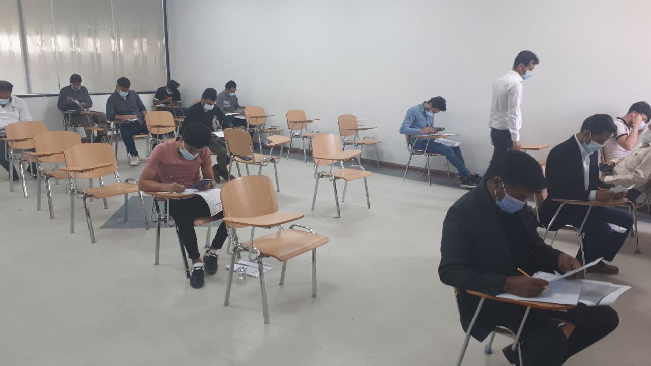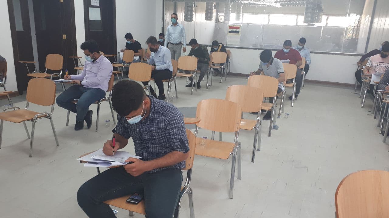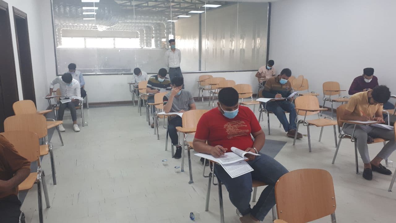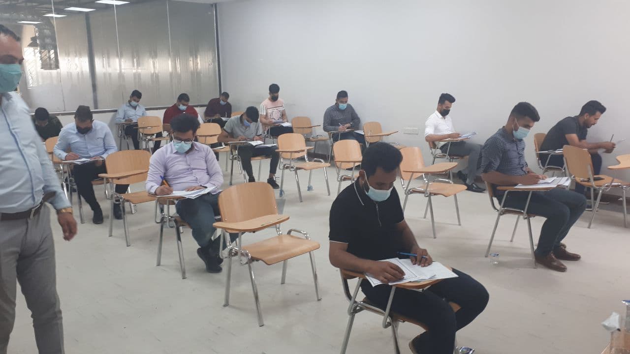 جانب من القاعات الامتحانية لقسم التكييف والتبريد في جامعه وارث الأنبياء ليوم الثلاثاء المصادف ٦ / ٤ / ٢٠٢١ والذي يعكس صوره مثاليه لتطبيق التباعد الاجتماعي والالتزام بارتداء الكمامات تنفيذا لقرارات خلية الأزمة لمنع تفشي فيروس كورونا.