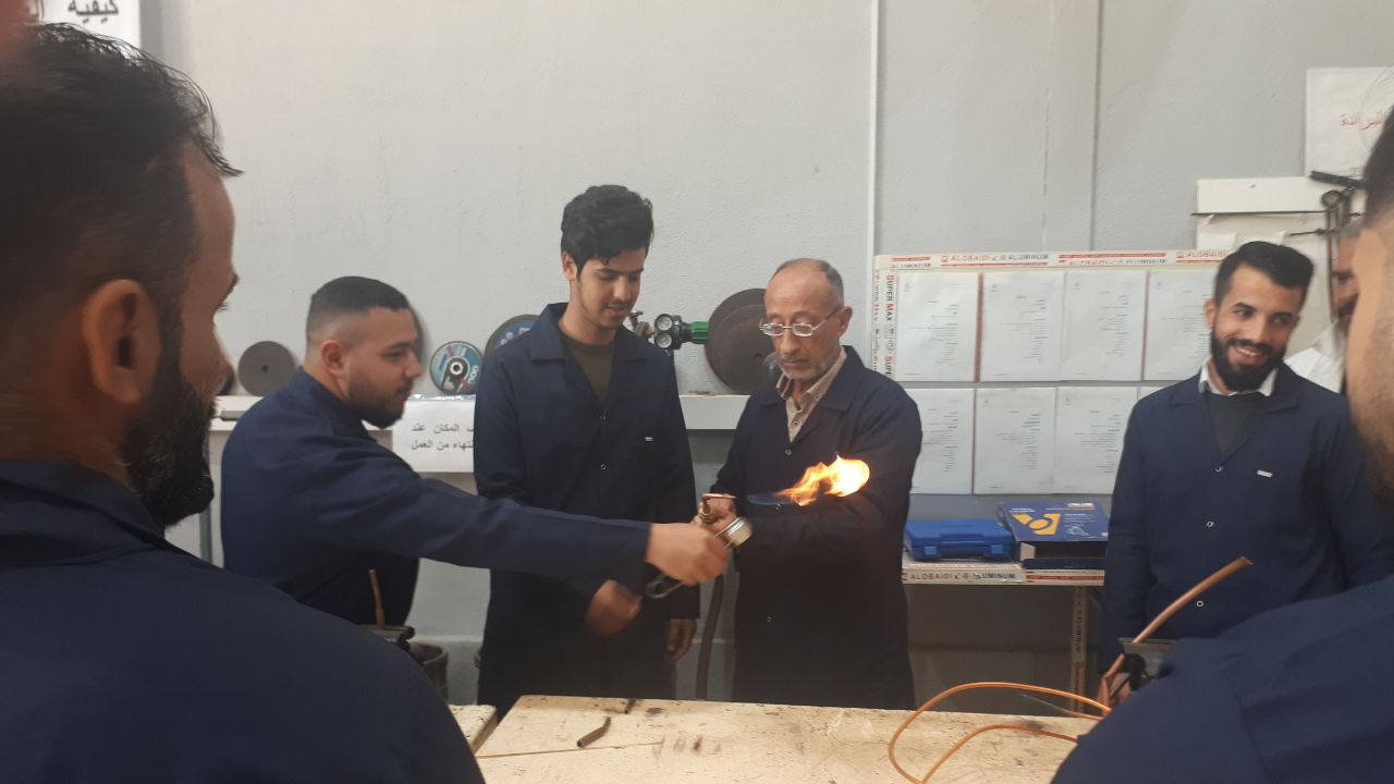 جانب من المحاضرات العملية لورشة اللحام لطلبة قسم هندسة تقنيات التكييف والتبريد حيث تدرب الطلبة على أجراء اللحام الغازي باستخدام غازي الاوكسي استلين والمستخدم في التطبيقات الصناعية لمجال التكييف والتبريد.