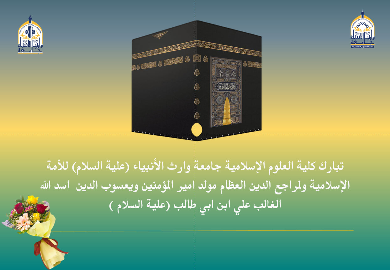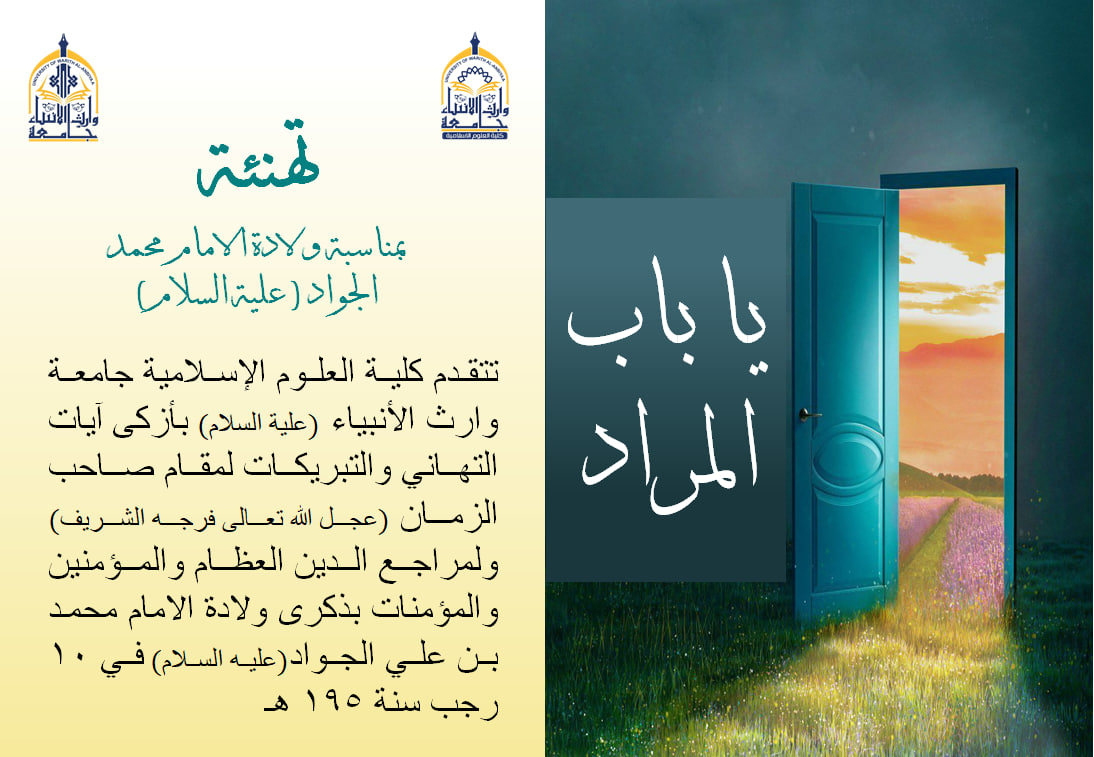 تتقدم كلية العلوم الإسلامية جامعة وارث الأنبياء (علية السلام) بأزكى آيات التهاني والتبريكات لمقام صاحب الزمان (عجل الله تعالى فرجه الشريف) ولمراجع الدين العظام والمؤمنين والمؤمنات بذكرى ولادة الامام محمد بن علي الجواد(عليه السلام) في ١٠ رجب سنة ١٩٥ هـ