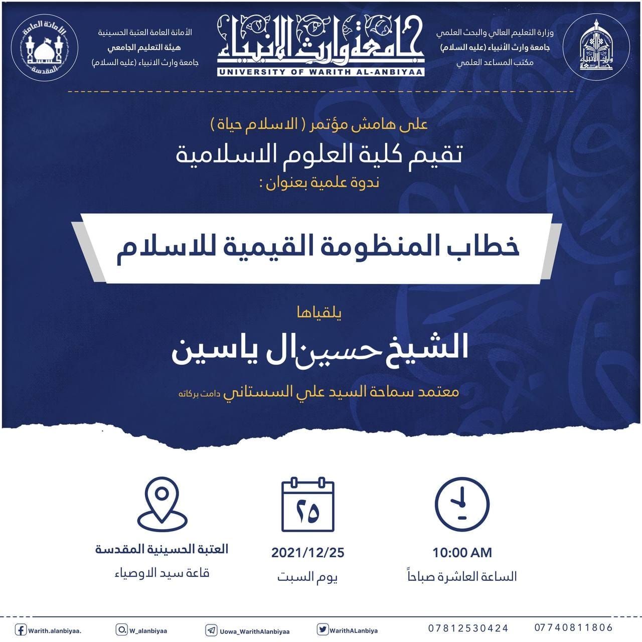 حرصا منها في ترسيخ المبادئ القيمية والأخلاقية التي أوصت بها الشريعة الإسلامية الغراء ولما لها من أثر طيب في بناء مجتمع صالح يزدهر بتراثه وثقافته الإسلامية لا سيما ترسيخ مبدأ الخطاب الإسلامي النابع من صميم الاسلام وتعاليمه رعت الأمانة العامة للعتبة الحسينية المقدسة المؤتمر الدولي السنوي الثالث والذي تقيمه كليتا العلوم الإسلامية في جامعة وارث الأنبياء وجامعة كربلاء تحت شعار الاسلام حياة وتحت عنوان اثر الخطاب الإسلامي في بناء المنظومة القيمية ووفق البرنامج المرفق والذي سيعقد في يوم السبت الموافق ٢٥/١٢/٢٠٢١