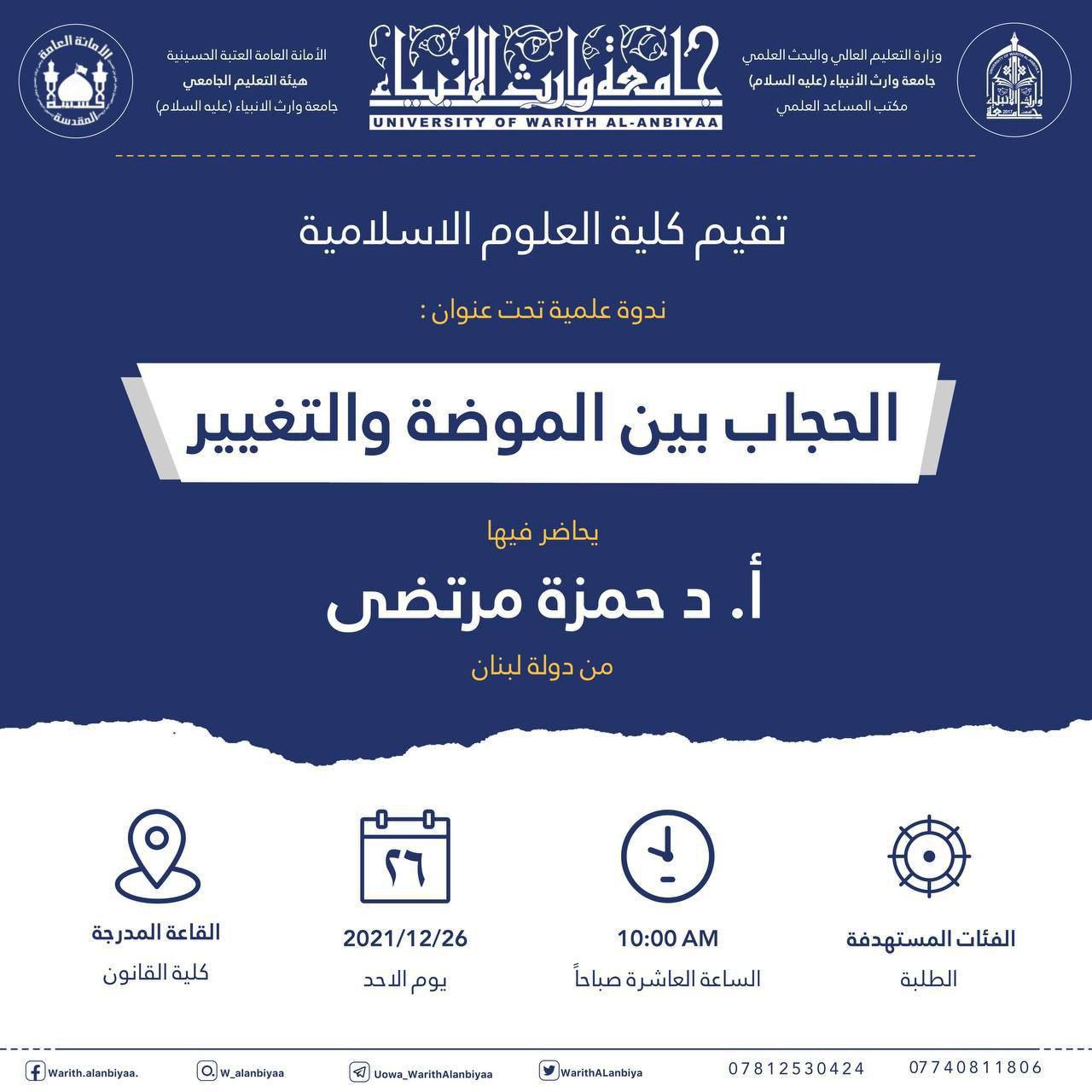 تقيم كلية العلوم الإسلامية ندوة علمية تحت عنوان ( دور المرأة في بناء المنظومة القيمية) يحاضر فيها (  الشيخ جعفر الإبراهيمي) في يوم الاثنين الموافق ١٧ / ١ / ٢٠٢١ في تمام الساعة العاشرة صباحا على القاعة المدرجة في بناية العلى