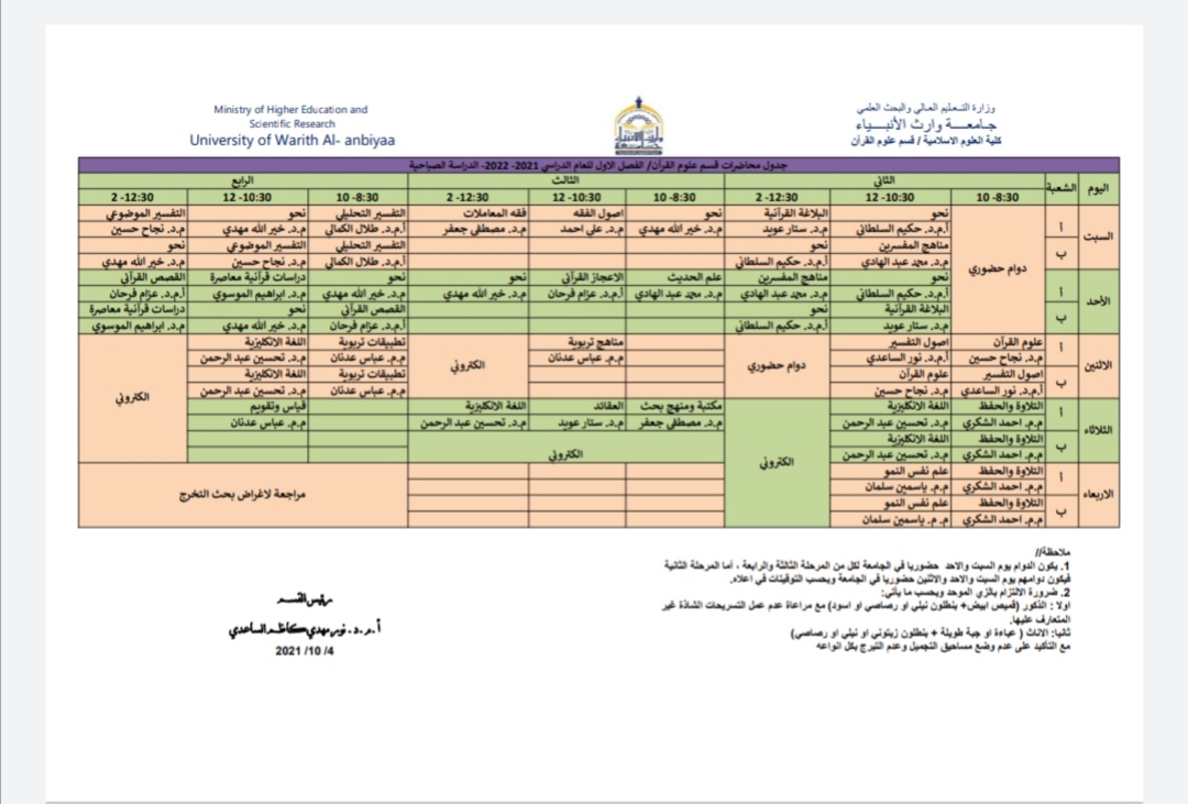 جدول الدروس الاسبوعي لقسم علوم القرآن / الدراسة المسائية