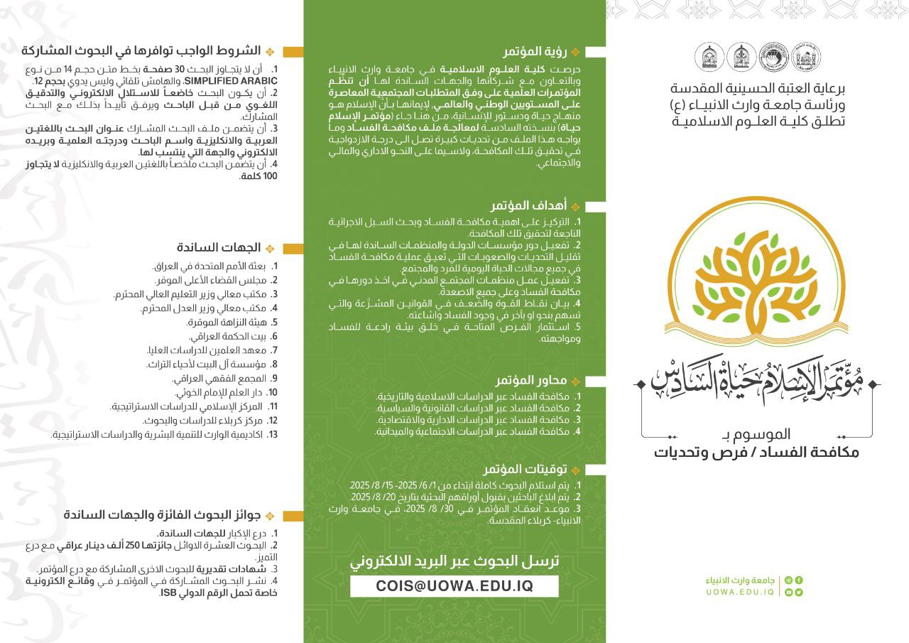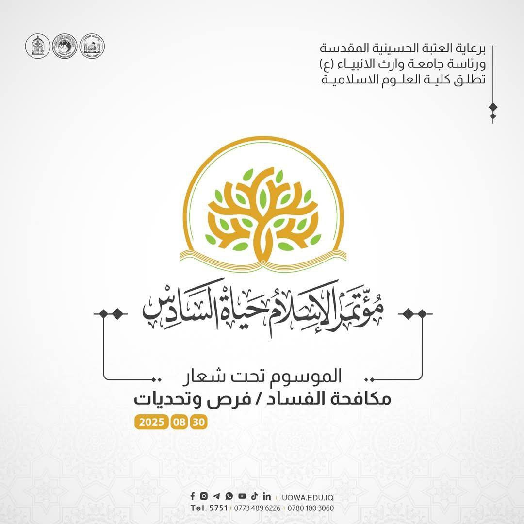 برعاية العتبة الحسينية المقدسة ورئاسة جامعة وارث الانبياء (ع) تطلق كلية العلوم الاسلامية  "مؤتمر الاسلام حياة السادس" الموسوم بـ مكافحة الفساد فرص و تحديات