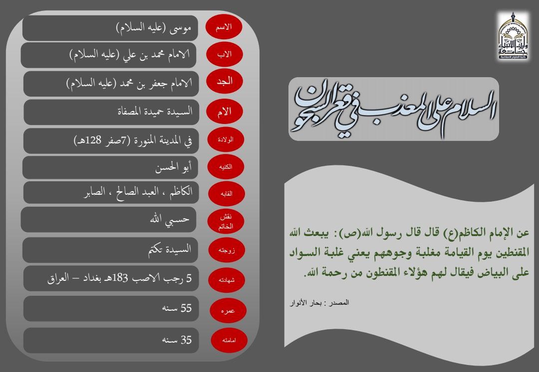 الى مقام صاحب العصر والزمان (عجل الله فرجه الشريف) ومراجعنا العظام والأمّة الإسلامية جمعاء بذكرى إستشهاد الإمام موسى بن جعفر الكاظم (عليه السلام) في الخامس والعشرين من رجب الأصب ، فسلامٌ عليك ياراهب آل محمد وأنت تجود بنفسك الطاهرة تتجرع ألم السم وتحوطك قيود الظالمين وسلاسلهم ، يا حليف السجدة الطويلة يامن عذبٍ في قعر السجون وظُلم المطامير سلامٌ عليك سيدي ولا حرمنا الله زيارتك في الدنيا وشفاعتك في الآخرة