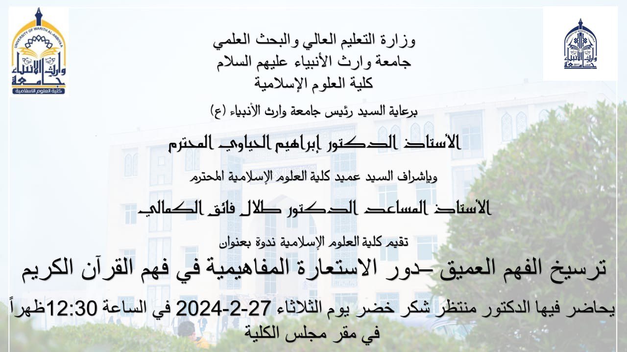 بتوجيهات ودعم من السيد رئيس جامعة وارث الأنبياء، الأستاذ الدكتور إبراهيم الحياوي، وتحت إشراف السيد عميد كلية العلوم الإسلامية الأستاذ المساعد الدكتور طلال فائق الكمالي، نظمت كلية العلوم الإسلامية في جامعة وارث الأنبياء ورشة علمية بعنوان: "ترسيخ الفهم العميق - دور الاستعارة المفاهيمية في فهم القرآن الكريم".