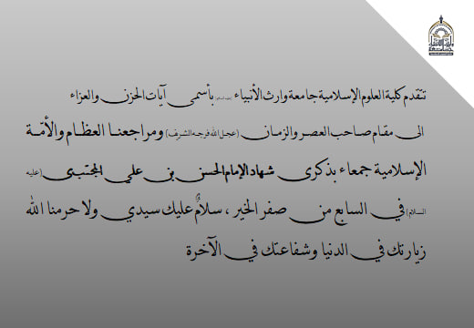 تتقدم كلية العلوم الإسلامية جامعة وارث الأنبياء (عليه السلام)  بأسمى آيات الحزن والعزاء الى مقام صاحب العصر والزمان (عجل الله فرجه الشريف) ومراجعنا العظام والأمّة الإسلامية جمعاء بذكرى شهاد الإمام الحسن بن علي المجتبى(عليه السلام) في السابع من صفر الخير ، سلامٌ عليك سيدي ولا حرمنا الله زيارتك في الدنيا وشفاعتك في الآخرة