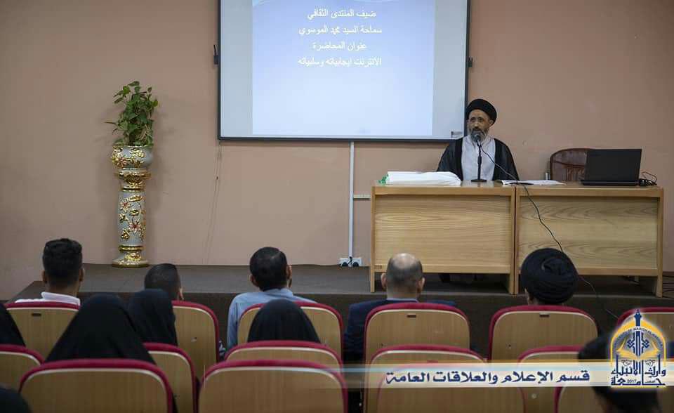 اختتم المنتدى الثقافي المقام برعاية كلية العلوم الاسلامية بمحاضرة سماحة السيد محمد الموسوي الموسومة بـ (الانترنيت ايجابياته وسلبياته ) اوضح فيها اهمية انتشال الطالب من الافكار الهدامة التي تغزو البلد عبر شبكات التواصل الانترنيت بوصفه سلاح ذو حدين ( يمكن الانتفاع منه والاضرار به ) . فتح السيد في محاضرته الباب امام الطلبة لطرح الاسئلة والمناقشة والحوار .