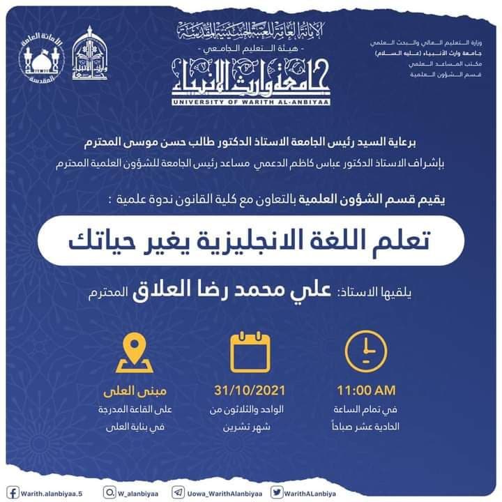 اقامت كلية القانون بالتعاون مع قسم الشؤون العلمية ورشة علمية بعنوان تعلم اللغة الانجليزية يغير حياتك ،يوم الأحد المصادف ٢٠٢١/١٠/٣١.