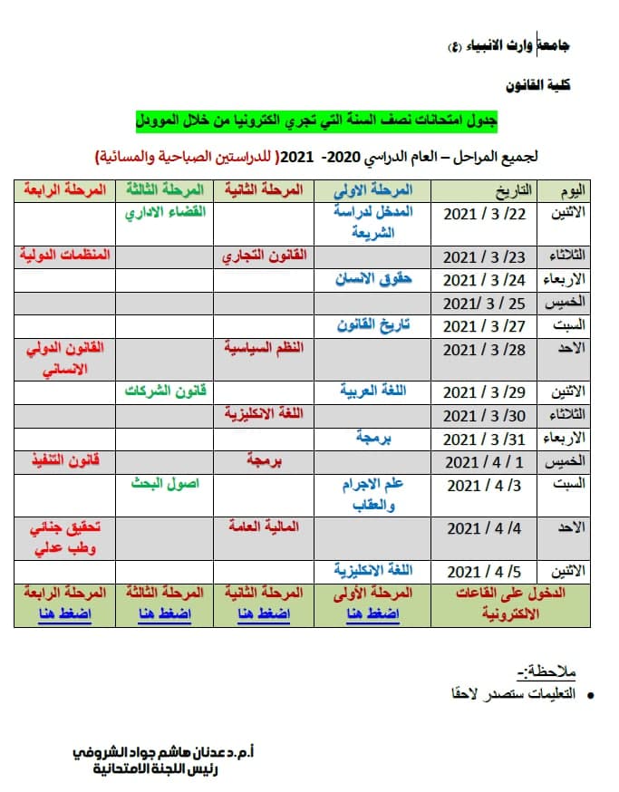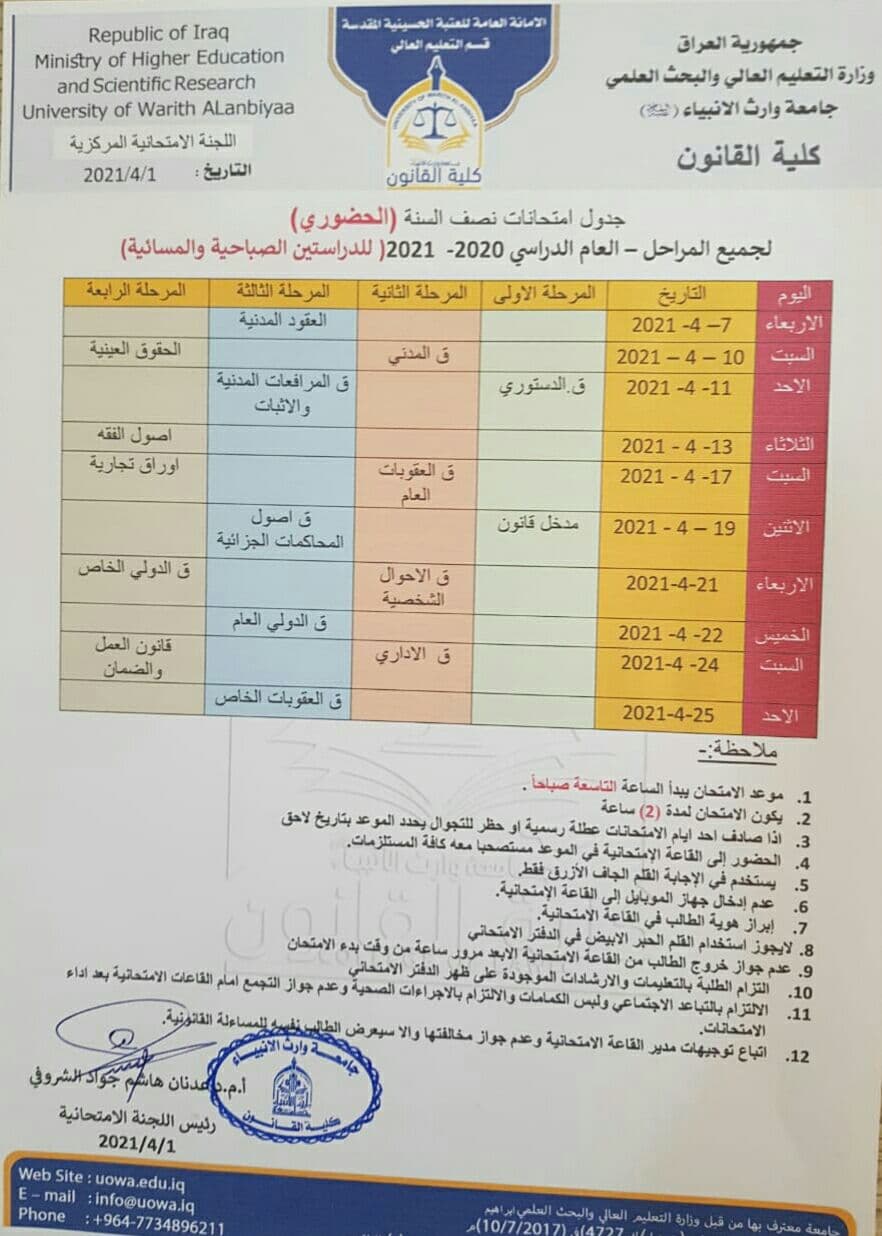 3.      اذا صادف احد ايام الامتحانات عطلة رسمية او حظر للتجوال يحدد الموعد بتاريخ لاحق