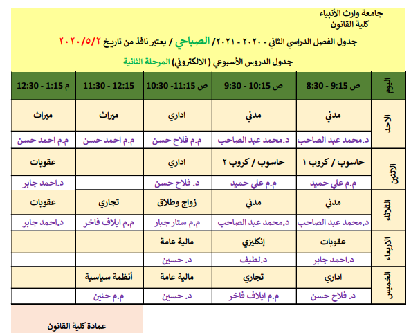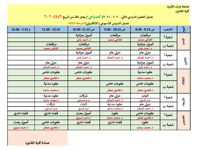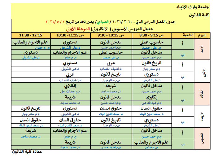 جدول المحاضرات الاسبوعية الالكتروني