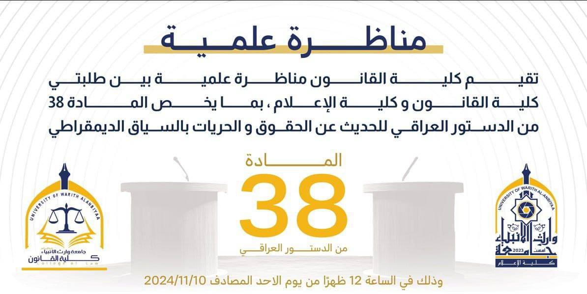 اجريت على قاعات  كلية القانون مناظرة علمية بين طلبتها وطلبة كلية الإعلام هي فرصة رائعة لاستعراض وجهات النظر المختلفة حول موضوعات تتعلق بالقانون والإعلام، وتبادل الأفكار والتفاعل بين الطلاب من مختلف التخصصات. مثل هذه المناظرات يمكن أن تكون غنية ومثرية، حيث  يتناول المشاركون موضوعات قانونية وإعلامية مشتركة أو متقاطعة.