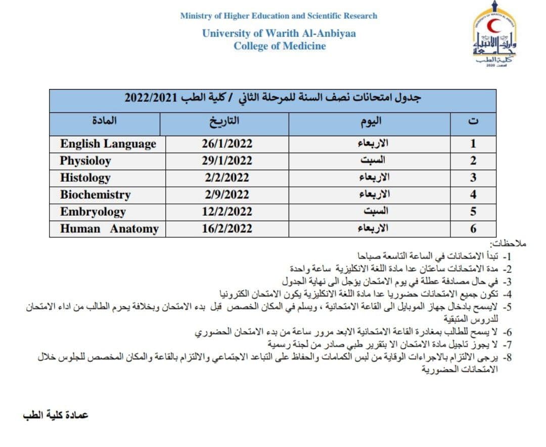 الامتحانات الحضورية لكلية الطب جامعة وارث للنصف الاول من العام الدراسي 2021-2022