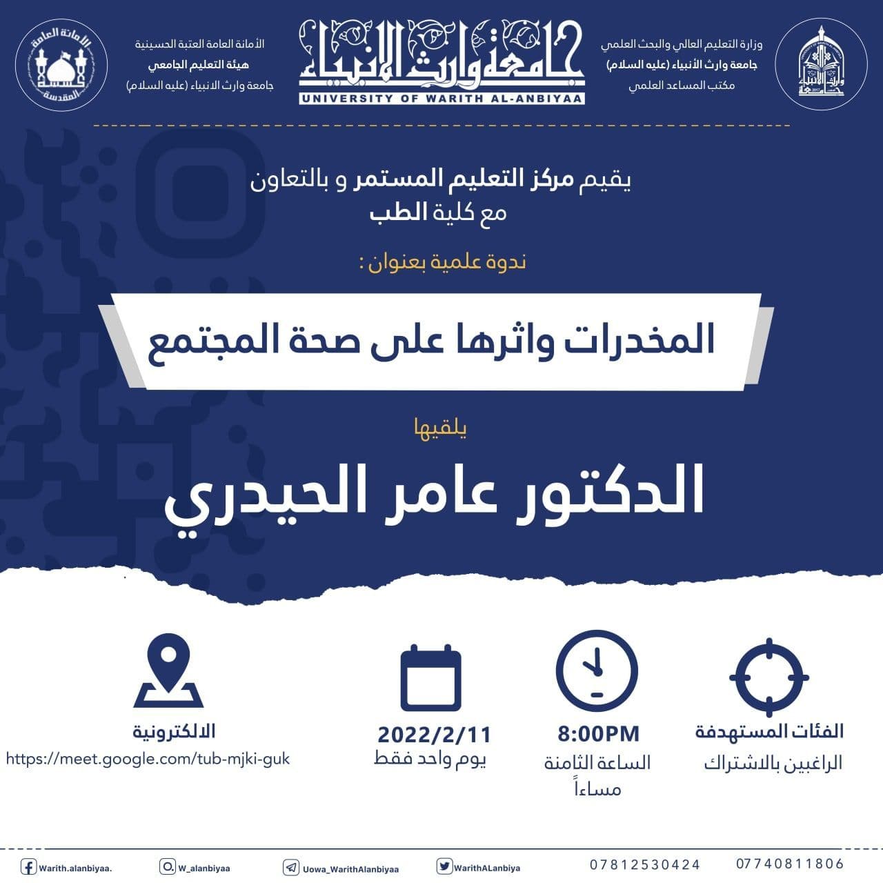 يقيم مركز التعليم المستمر في جامعة وارث الانبياء (عليه السلام) ندوه علمية بعنوان ( المخدرات واثرها على صحة المجتمع) يحاضر في الندوه ( الدكتور عامر الحيدري) من دائرة صحة كربلاء تقام الدورة الكترونيا يوم الجمعة الموافق 11/2/2022 في تمام الساعة (8:00)مساءا الراغبين في المشاركة الدخول على الرابط (https://meet.google.com/tub-mjki-guk)