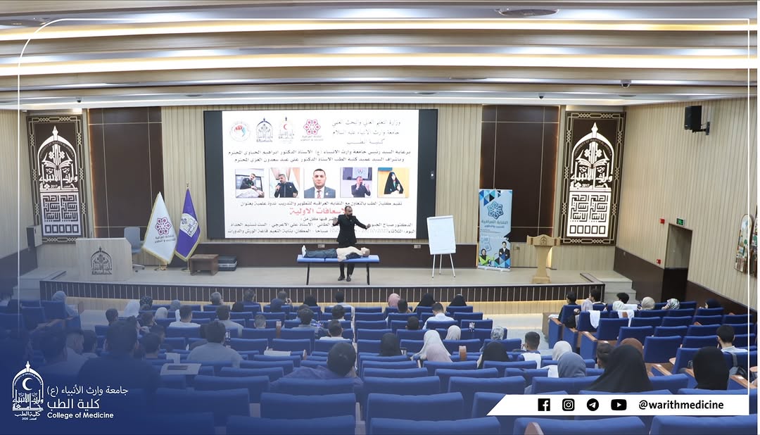 برعاية السيد رئيس جامعة وارث الأنبياء (ع) الأستاذ الدكتور إبراهيم الجياوي المحترم وبإشراف السيد عميد كلية الطب الأستاذ الدكتور علي عبد سعدون الغزي المحترم وبالتعاون مع النقابة العراقية للتطوير والتدريب أقامت كلية الطب ثلاث ندوات علمية تطويرية تهدف إلى تعزيز الوعي الأكاديمي والإنساني لدى الطلبة والتدريسيين وذلك صباح يوم الثلاثاء الموافق 28 / 10 / 2025 في قاعة الورش والدورات في بناية النعيماستُهلت الندوات بتلاوة سورة الفاتحة على أرواح شهداء العراق ثم عُزف النشيد الوطني العراقي وسط أجواء من الاعتزاز والانتماء الوطني والجامعي وقد تناولت الندوات محاور متعددة تمحورت حول قوة الكلمة ووعي الموقف ولغة الحوار وأهمية التواصل البنّاء في الحياة الجامعية والمهنية إضافة إلى محور الإسعافات الأولية الذي تضمن عروضاً عملية وتطبيقات ميدانية حول كيفية التعامل مع الحالات الطارئة قبل وصول الكادر الطبي ألقى الندوات كل من الدكتور صباح الجبوري والأستاذ مصطفى الطائي والأستاذ علي الأعرجي والأستاذة تسنيم الحداد الذين أثروا الحضور بمعلوماتهم وخبراتهم الميدانية وفي ختام الفعاليات قام السيد عميد كلية الطب الأستاذ الدكتور علي عبد سعدون الغزي بتوزيع الشهادات التقديرية على السادة المحاضرين تقديراً لجهودهم المتميزة في إنجاح هذه الندوات