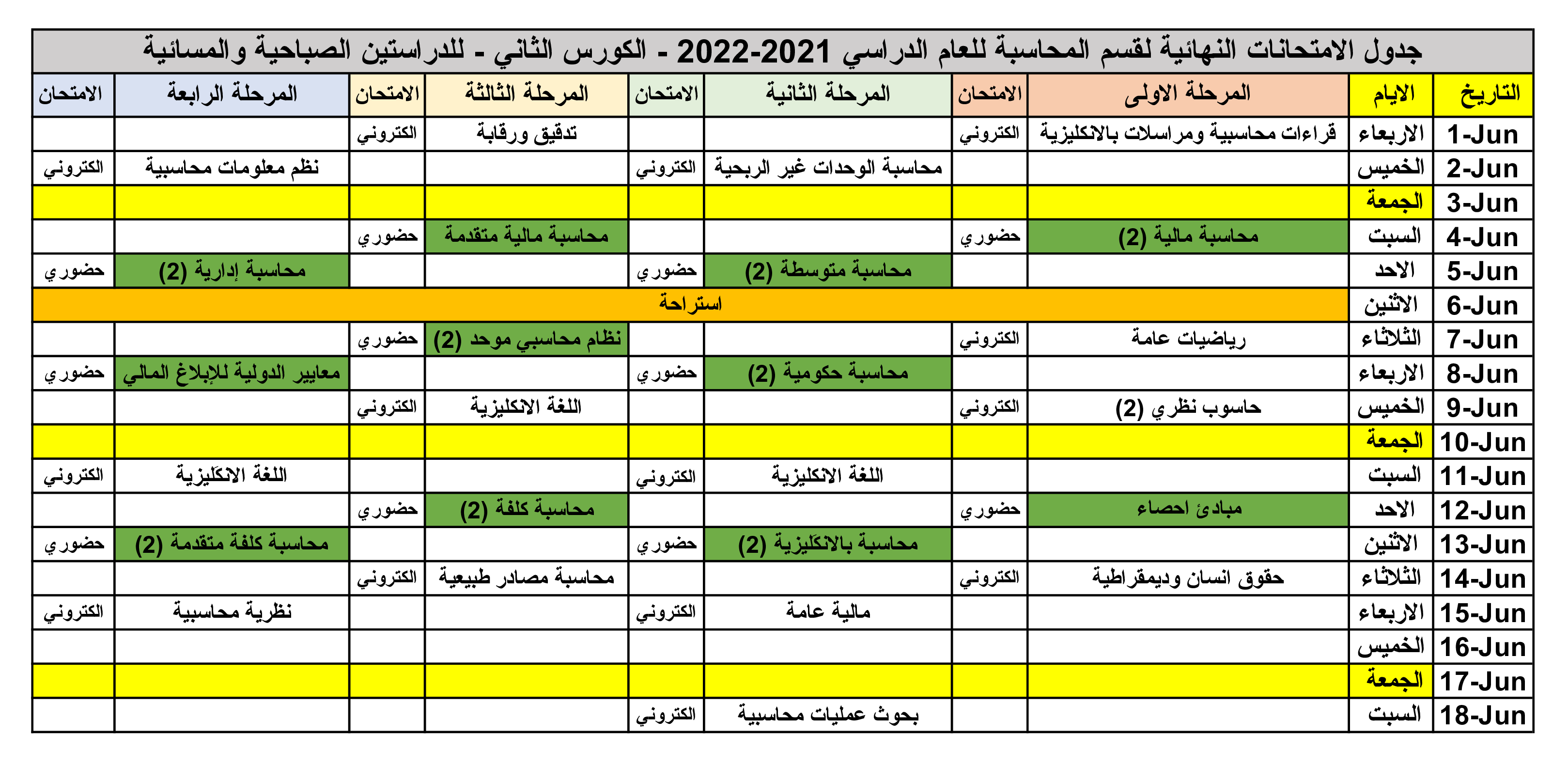 جدول الامتحانات النهائية لقسم المحاسبة للعام الدراسي 2021-2022