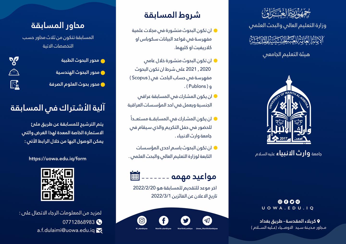 تحت شعار ( البحث العلمي الرصين مقياساً لرقي الأمم وتطورها)تقيم جامعة وارث الأنبياء(عليه السلام)مسابقتها الأولى للتميز البحثي،وتدعو السادة الباحثين للاشتراك في مسابقتها الأولى لتكريم أفضل الباحثين الأكاديميين العراقيين المتميزين في النشر العلمي الرصين في التخصصات الطبية، والهندسية، و العلوم الصرفة، وفق الشروط الموجودة في المرفقات.أهداف المسابقة: