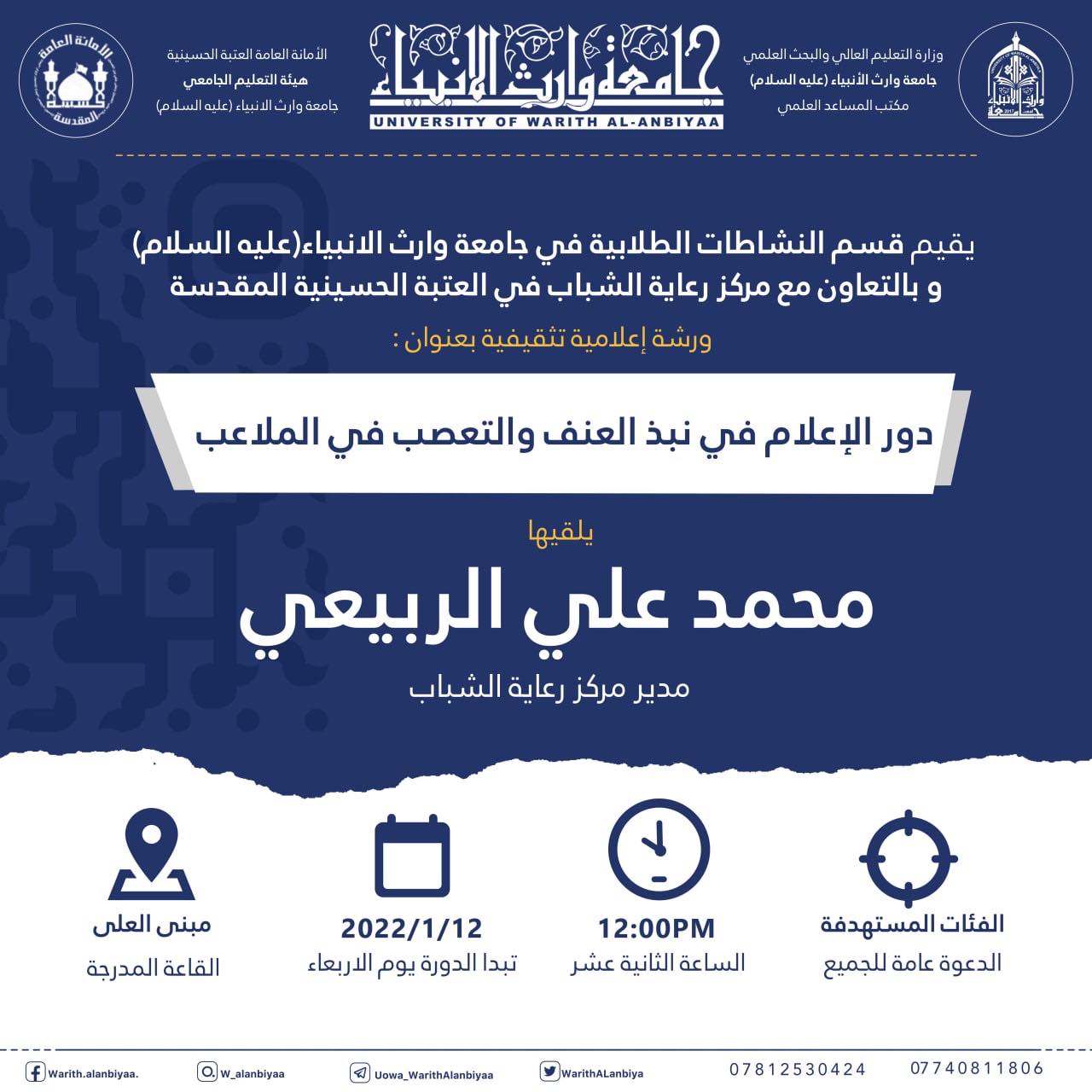 أقام قسم النشاطات الطلابية في جامعة وارث الأنبياء(عليه السلام) وبالتعاون مع مركز رعاية الشباب التابع للعتبة الحسينية المقدسة ورشة إعلامية تثقيفية بعنوان(دور الاعلام في نبذ العنف والتعصب في الملاعب) قدمها السيد محمد علي الربيعي مدير مركز رعاية الشبابوقال الدكتور همام عبد العباس رئيس قسم النشاطات الطلابية في الجامعة: ان الهدف من الورشة هو تثقيف الشباب الجامعي الرياضي حول دورهم في نبذ العنف والتعصب في الملاعب والحياة بشكل عام ،باعتبار ان الاخلاق الرياضية مهمة في المحافل الدولية التي تعكس سمعة البلد, اذ اكدت الورشة على الشباب الرياضي الواعي محاربة التعصب والعنف داخل الملاعب الرياضية والحفاظ على الممتلكات العامة داخل وخارج الملاعب.وتضمنت الورشة إقامة مباراة ودية بين فريق جامعة وارث الأنبياء(عليه السلام) وفريق كلية الطف الجامعة لتهيئة الفريقين للمشاركة في البطولة الرياضية الوزارية حيث انتهت المباراة بفوز فريق جامعتنا(5-1).