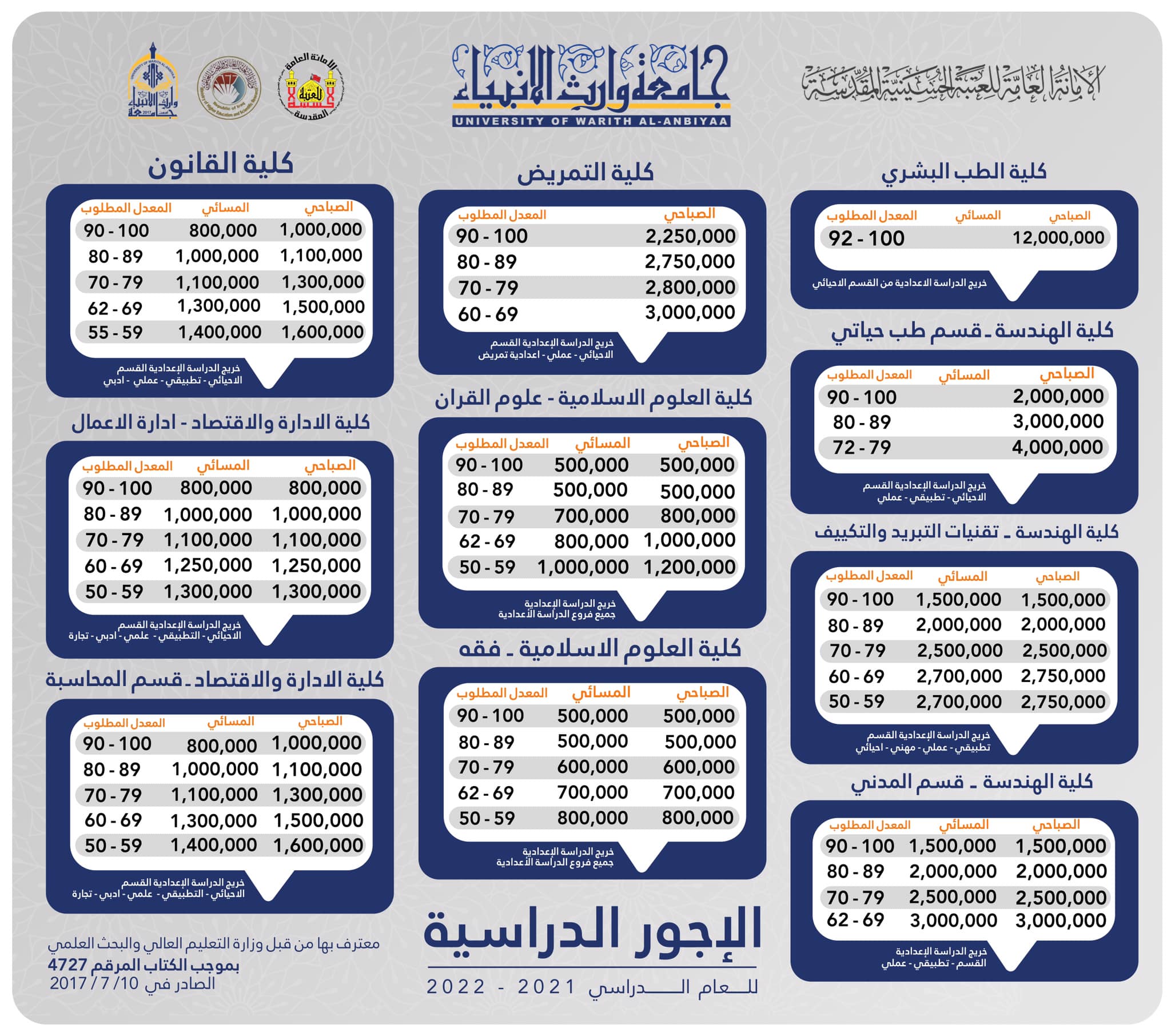 جامعة وارث الانبياء(عليه السلام) تستحصل موافقة وزارة التعليم العالي والبحث العلمي لاستحداث قسم العلوم المالية والمصرفية الإسلامية في كلية العلوم الإسلامية للدراسة الصباحية فقطيقبل القسم خريجي احيائي + تطبيقي + علمي + ادبي + وخريجي مراكز التدريب المهني الذي تكون مدة الدراسة فيها ثلاث سنوات الطلبة الذين ادوا الامتحان الوزاري في الاختصاص المناظر+الاعداديات الاسلامية التابعة للتربية(صباحي ومسائي) +الاعداديات الاسلامية التابعة للوقفين (الدراسة الصباحية طلبة الدراسة الخارجية (من ادو الامتحان التقويمي فقط))+ معهد اعداد معلمين (قسم الدراسة الاسلامية ، قسم اللغة العربية)