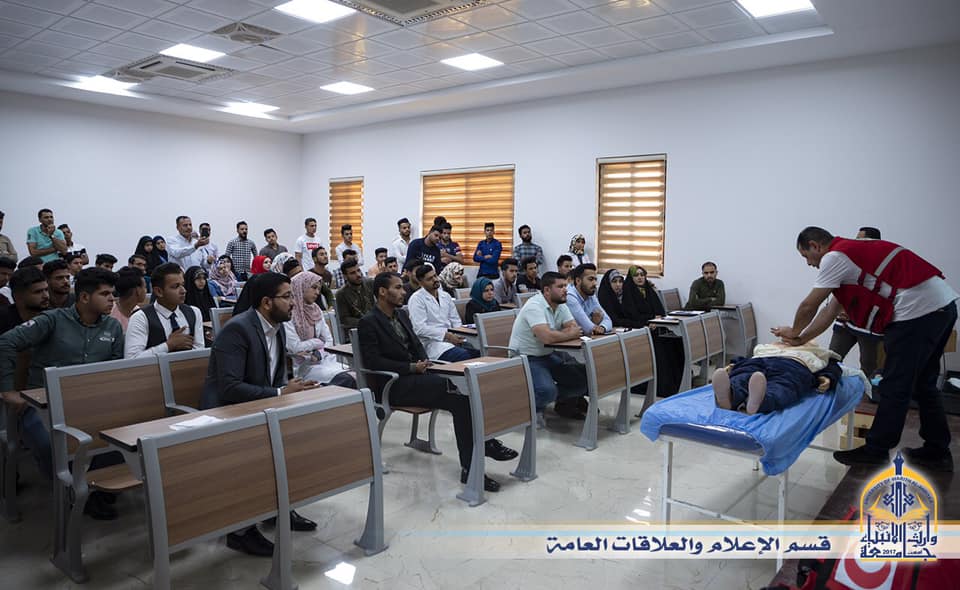 نظم مركز التعليم المستمر في جامعة وارث الانبياء(عليه السلام) وبالتنسيق مع جمعية الهلال الأحمر العراقي فرع كربلاء المقدسة ورشة عمل تدريبية لمنتسبي الجامعة والطلبة في الأسعافات الأولية ، وتضمنت الورشة تدريب المشاركين على كيفية اسعاف المرضى والجرحى في الحالات الطارئة والحوادث وماهي الحالات البديلة قبل نقل المريض الى المستشفى في الدقائق الأولى من الأصابة والتي شملت كافة الخطوات الواجب القيام بها للتعامل مع هذه الحالات بالشكل المبسط وبتطبيق عملي لتسهيل التعلم والتصرف بحكمة لتفادي هذه المشاكل مثل حالات (الاختناق , الغرق , الحريق , والانفجارات) والحالات الاضطرارية كحالات فقدان الوعي ، والتعامل مع كل حالة بشكل يختلف عن الاخر فضلا عن التدريب على مبادئ الاسعافات الاولية في الحالات الطارئة نتيجة الاحداث التي يتعرض لها البلد وما يتعرض له المواطن في حياته اليومية ، فيما اكد السيد سامر نزار عبد مدرب اسعافات اولية في جمعية الهلال انه من الضروري تدريب الجميع على الاسعافات الاولية لأنها تعد الطريقة المثلى لانقاذ حياة المواطنين في الدقائق الاولى لوقوع الحادث والتي تعد الدقائق الذهبية لأنقاذ حياة المصاب.