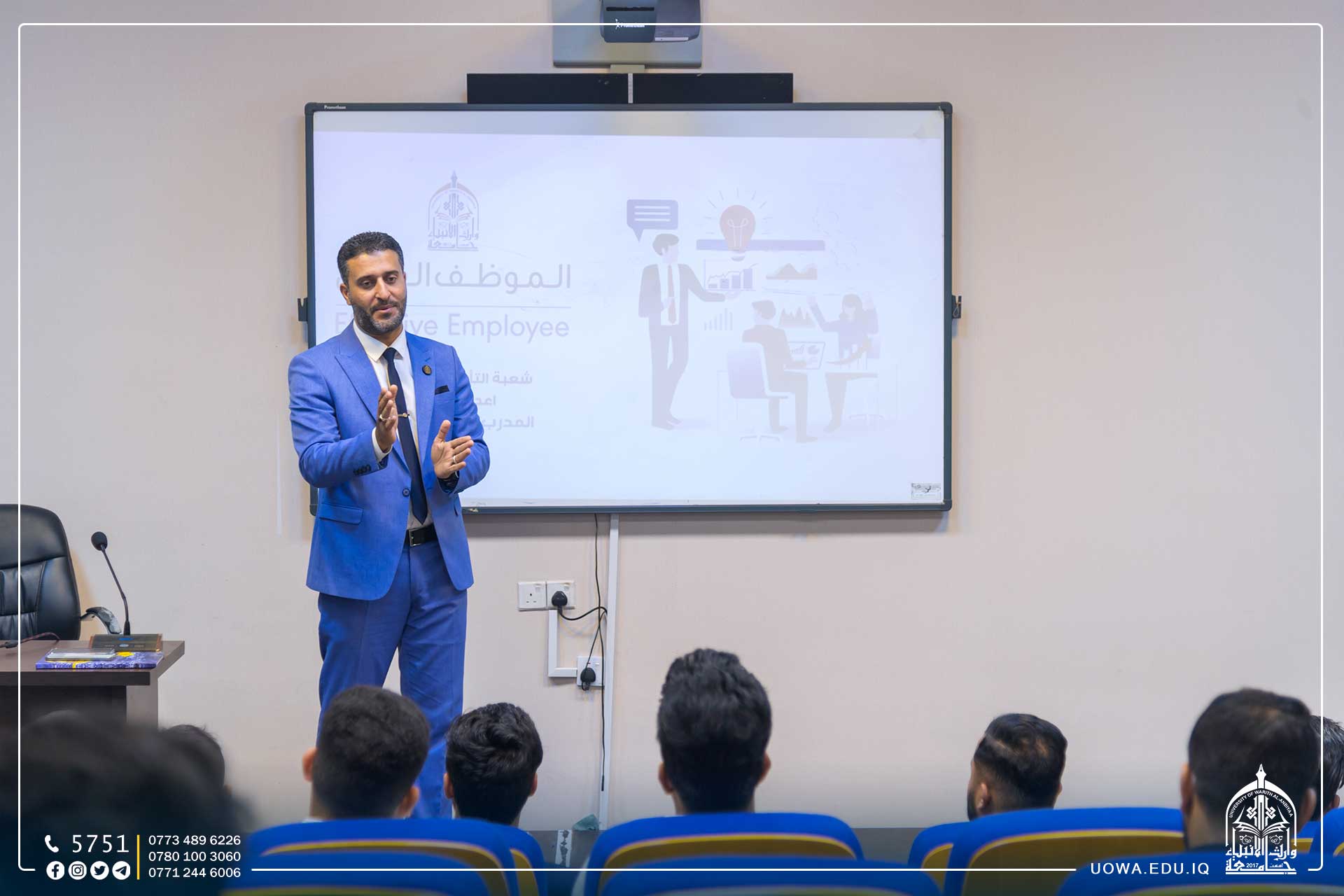 ضمن انشطتها الهادفة لتأهيل خريجي الجامعة للدخول في سوق العمل، أقامت شعبة التأهيل والتوظيف والمتابعة في جامعه وارث الانبياء(عليه السلام)، وبحضور السيد رئيس الجامعة الاستاذ الدكتور ابراهيم الحياوي دورة تدريبية للطلبة الخريجين وطلبة المرحلة الرابعة بعنوان (الموظف المثالي) التي تستمر لمدة ثلاثة أيام يقدمها الاستاذ (صفاء السيلاوي) مدير الشعبة.