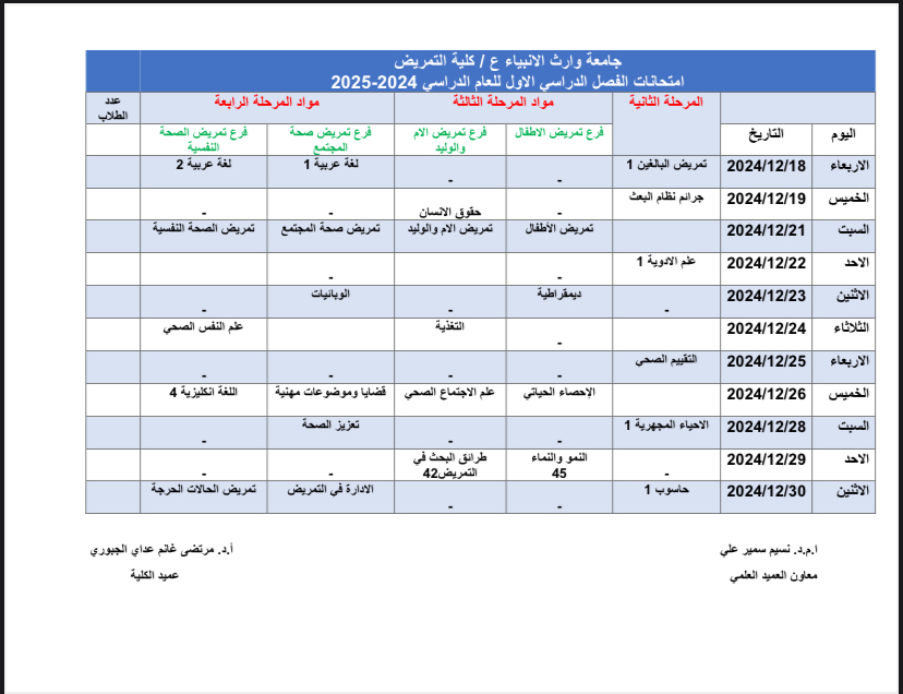جدول امتحانات الفصل الدراسي الاول للعام 2024-2025 للمرحلة الثانية والثالثة والرابعة