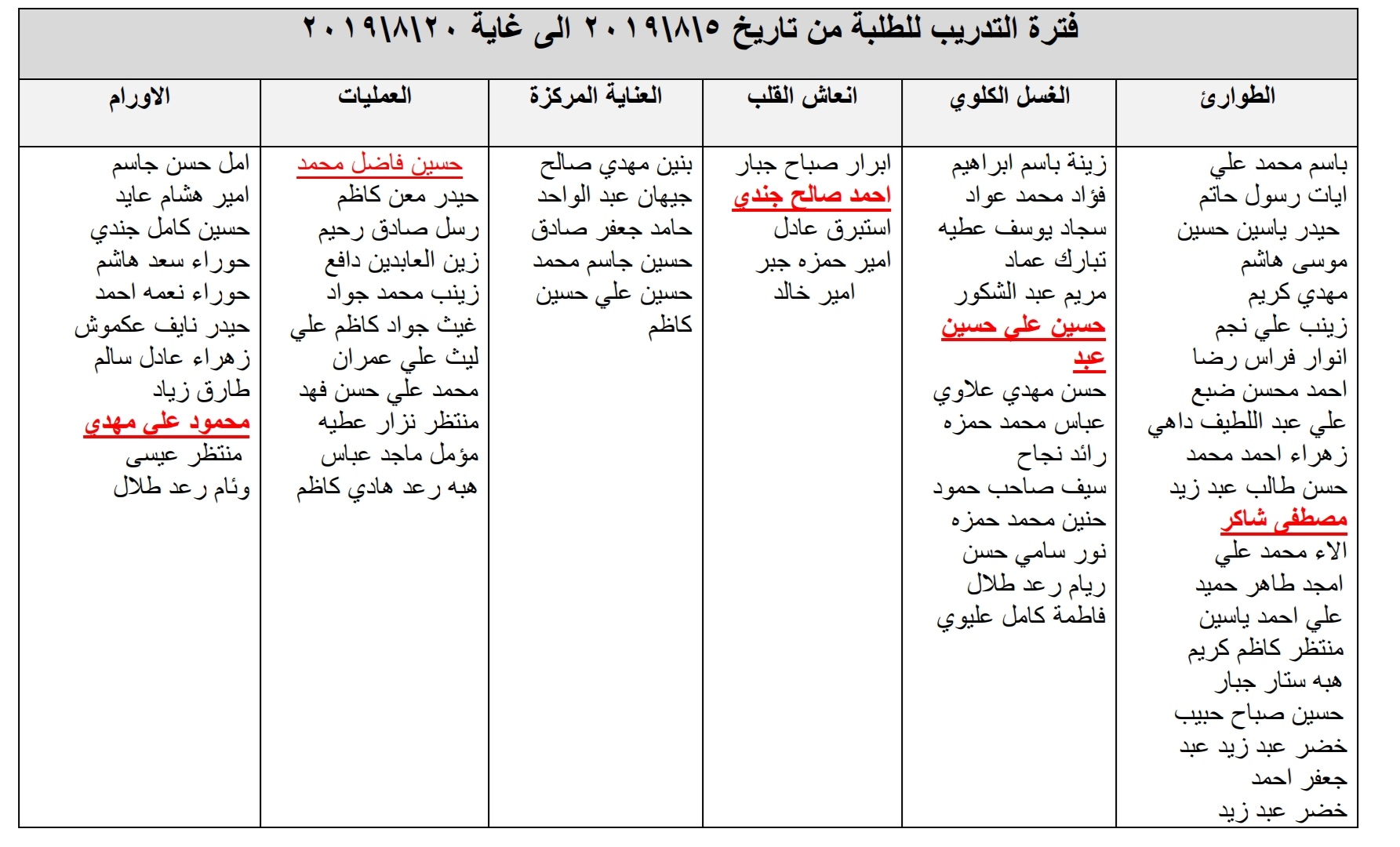 اعزائنا طلبة المرحلة الثانية اليكم توزيع الطلبة على ردهات المستشفى الحسيني بدءا من تأريخ ٢٠١٩/٨/٥ ولغاية ٢٠١٩/٨/٢٠.