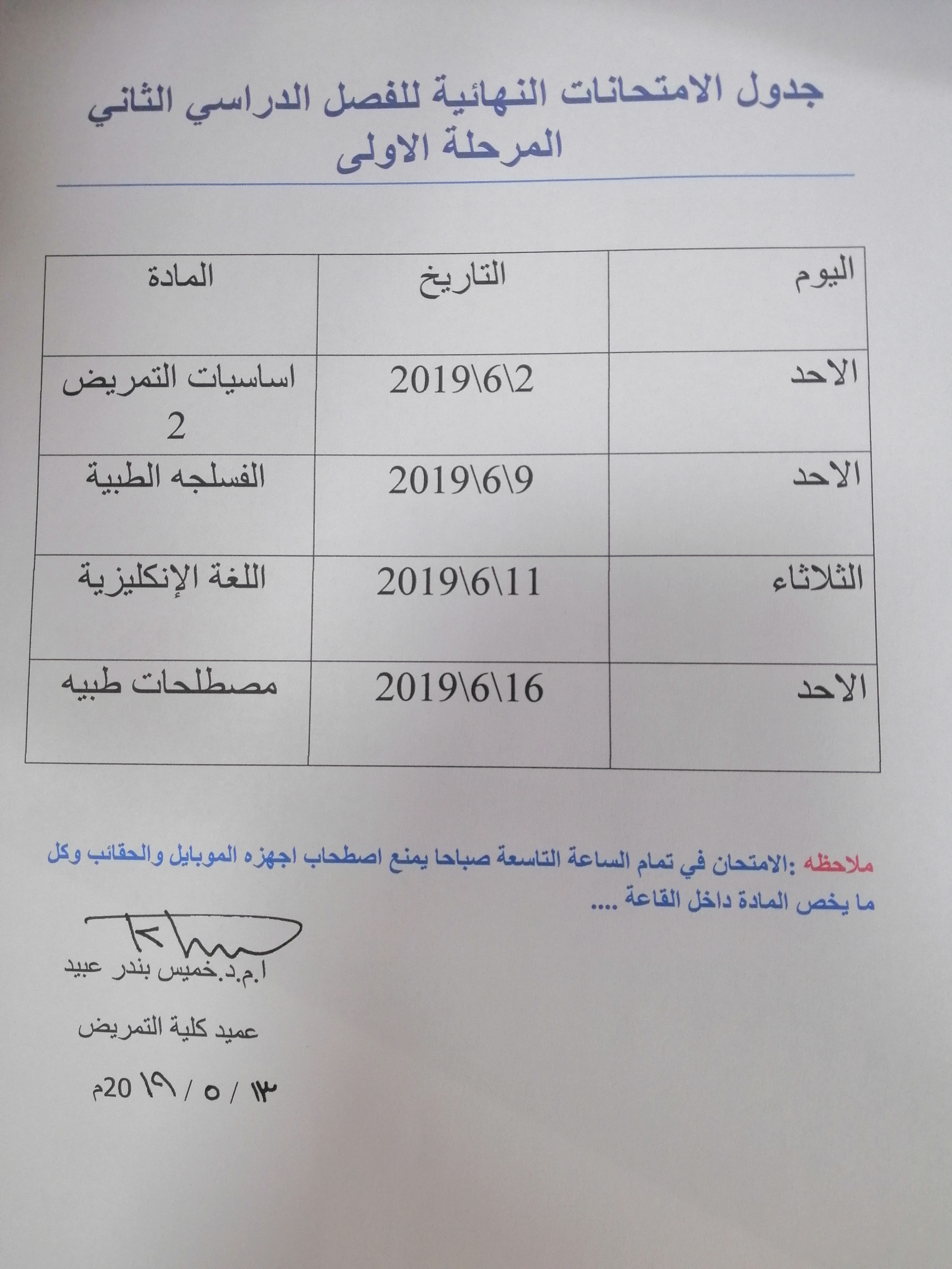 جدول الامتحانات النهائيه النظري للمرحلتين الاولى والثانيه الكورس الثاني للعام الدراسي ٢٠١٨/٢٠١٩