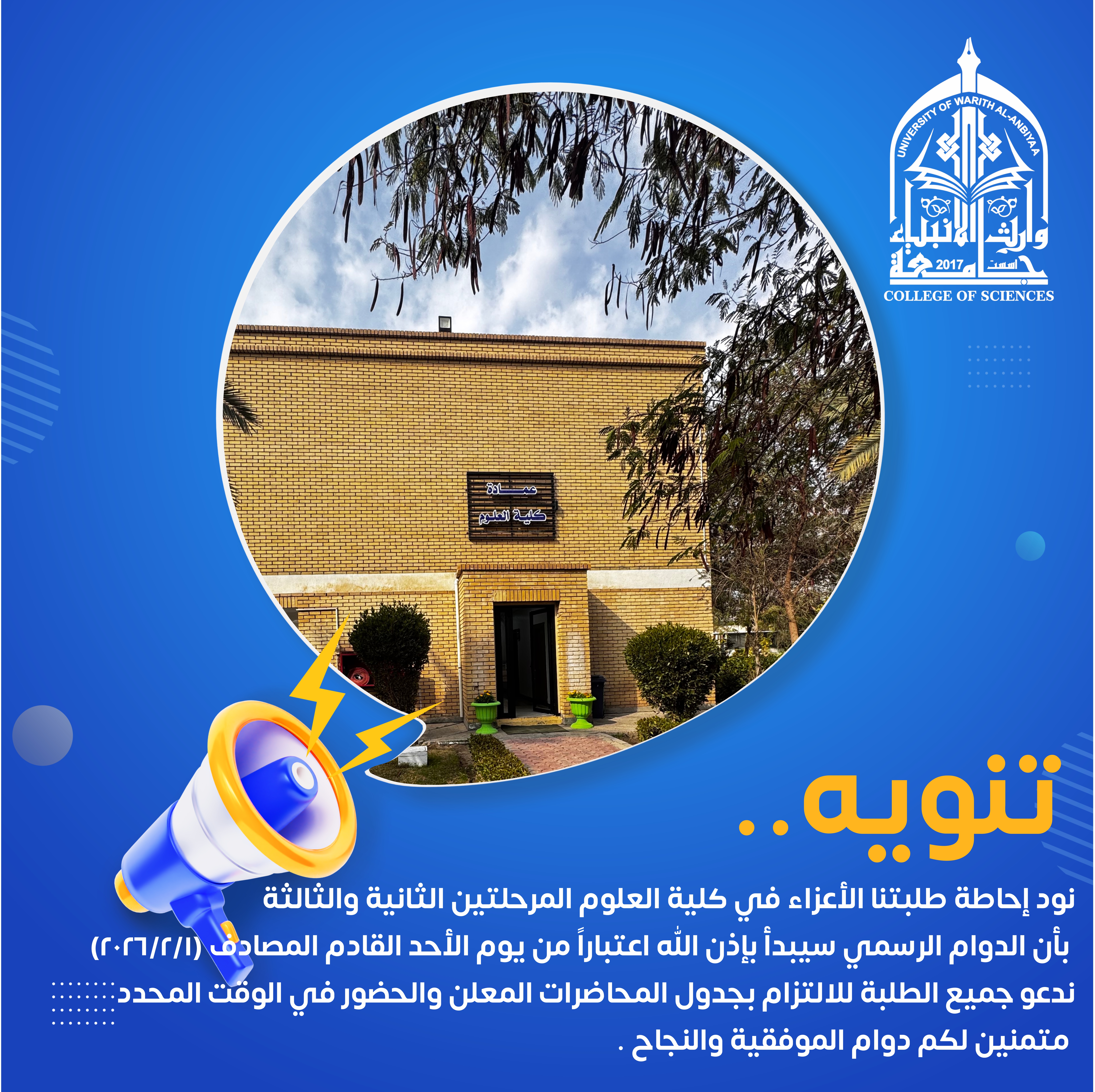 نود إحاطة طلبتنا الأعزاء في كلية العلوم المرحلة الاولى بأن الدوام الرسمي سيبدأ بإذن الله اعتباراً من يوم السبت القادم المصادف (2026/3/7)وعليه، يُرجى من جميع طلبتنا الأعزاء الالتزام بالحضور في الموعد المحدد،والتقيد بالتعليمات والضوابط الأكاديمية المعمول بها، حرصاً على انتظام المسيرة التعليمية وتحقيق أفضل مستويات الأداء العلميمع تمنياتنا بالتوفيق والنجاح الدائم...